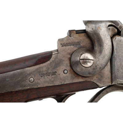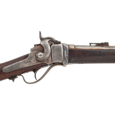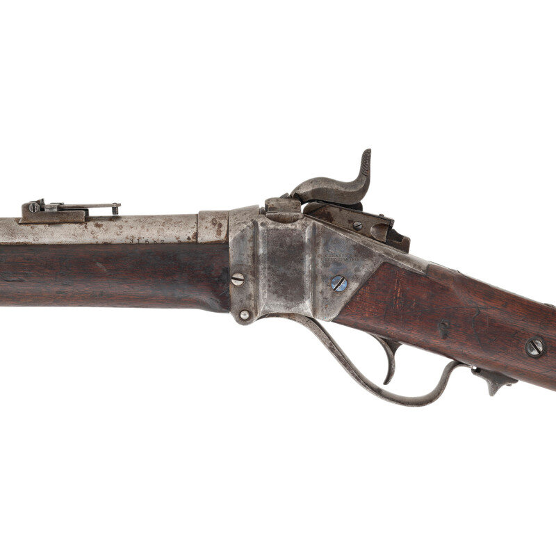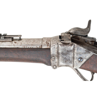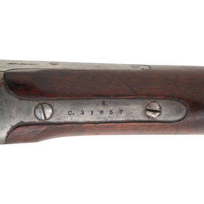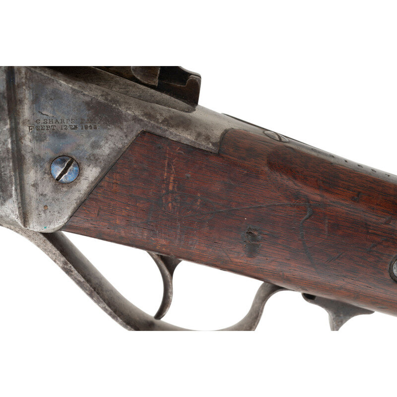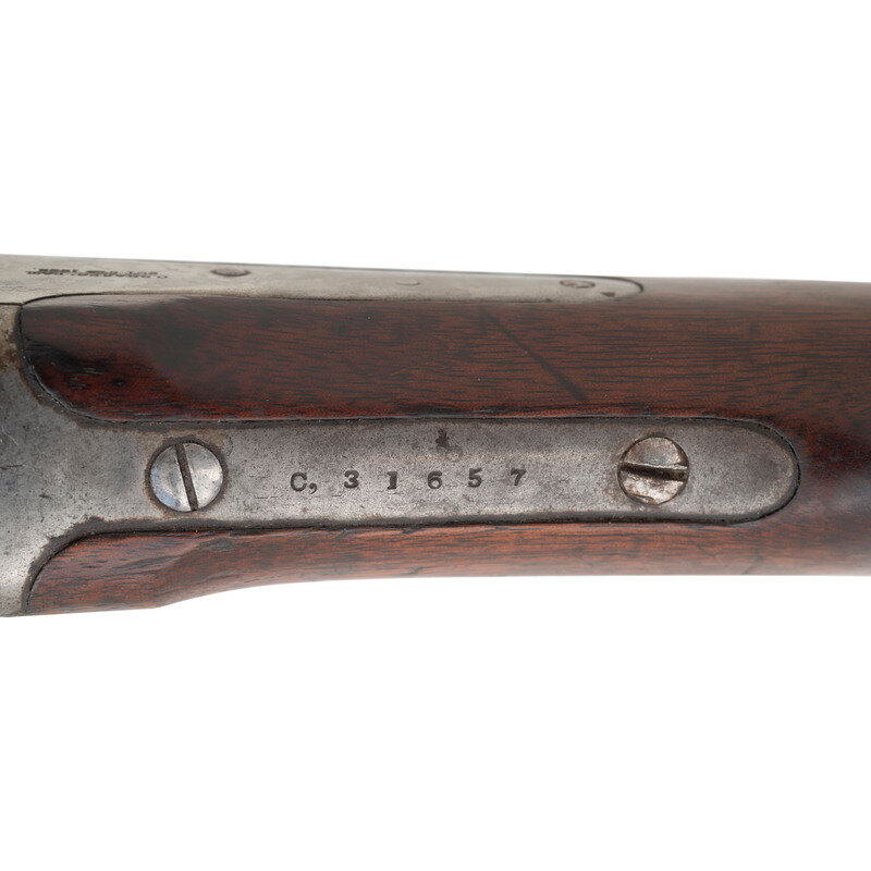 .50-70. 35.5" barrel. SN: C,31657. Bright barrel and furniture, color casehardened receiver, walnut stock and forend with two solid spring retained bands. Single shot breechloading military rifle with M1868 pattern rear sight, combination musket style front sight and socket bayonet lug, sling swivels and a jag head cleaning rod. Repurposed Civil War era Sharps lock altered to cartridge, a direct predecessor to the M1874 Sharps action. Standard Civil War era percussion lock and receiver markings. Springfield produced barrel numbered 31657 to match the receiver. Script ESA cartouche at reverse wrist. About 700 of these cartridge altered Sharps rifles were assembled at Springfield Arsenal circa 1870 and were issued in limited quantities for field trials. A scarce Indian Wars period experimental and trials rifle. {ANTIQUE}