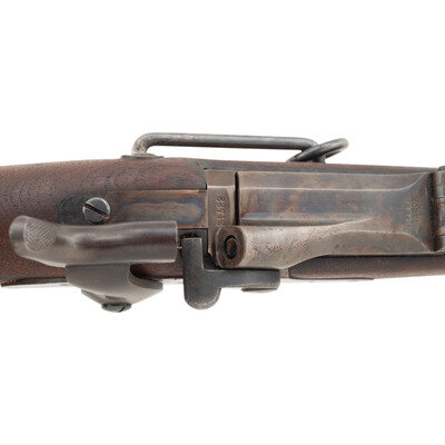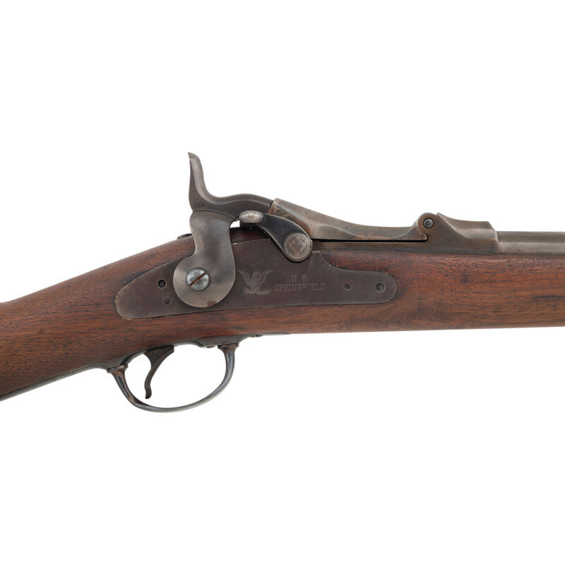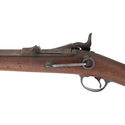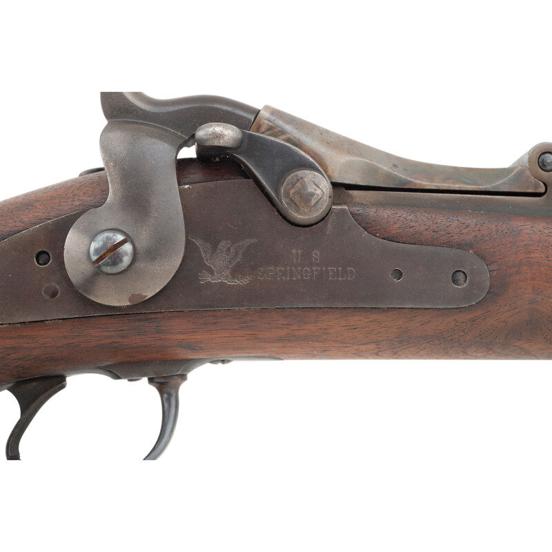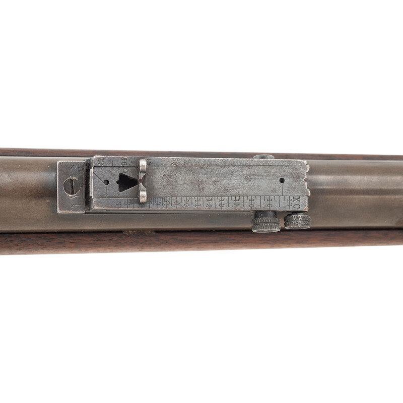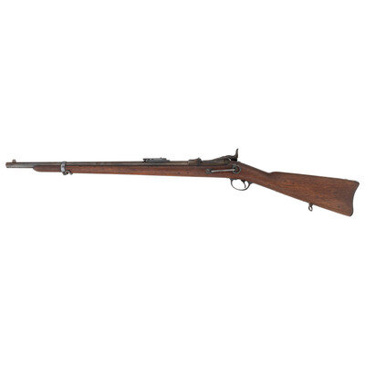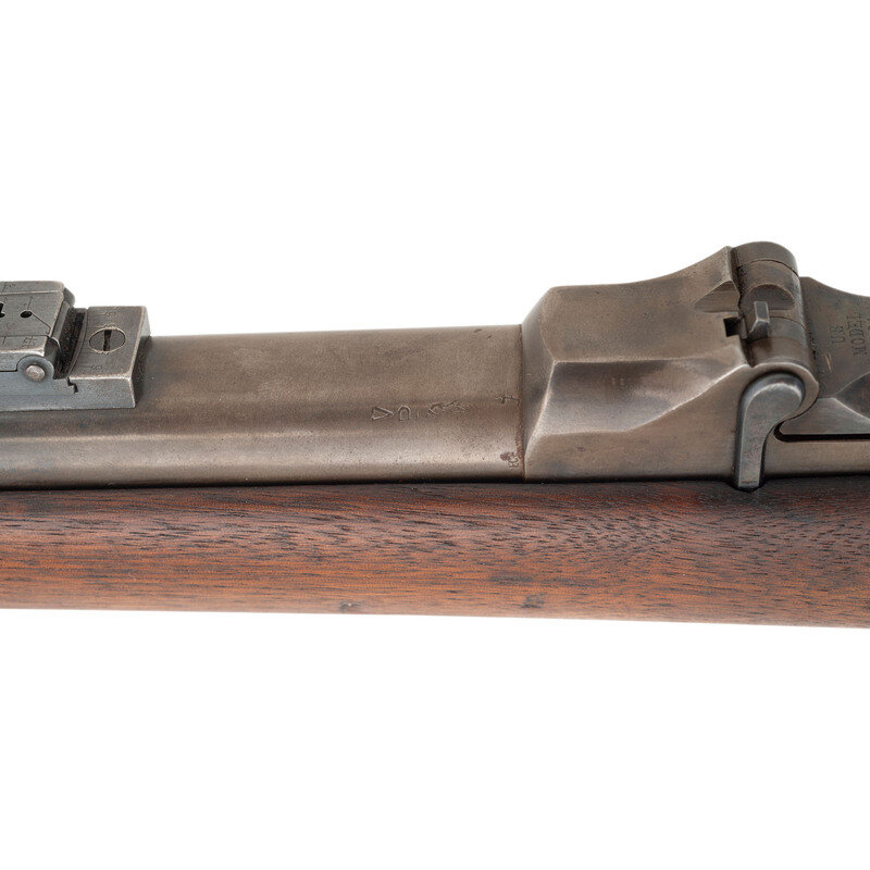 .45-70. 24" barrel. SN: 337421 (mfg. ca. 1886). Blued and color casehardened finish, walnut stock. Single shot breechloading experimental carbine with Trapdoor action, nearly full-length stock with single solid, spring-retained barrel band, three click tumbler, grooved trigger, trap in butt for cleaning rods and tools, correctly marked XC Buffington rear sight, block with pinned blade front sight, sling bar and ring and sling swivels with correctly curved upper swivel to allow the gun to be placed in the carbine boot or scabbard. Lock marked with a {Spread-Winged Eagle} and U.S./SPRINGFIELD forward of the hammer and low arch breech block with U.S./MODEL/1873 markings. Breech of barrel with V/P/{Eagle Head}/P marks. No visible cartouche. Only 1,000 of these scarce experimental "24-Inch Carbines" were produced at Springfield in 1886 for field trials. The guns were widely issued to cavalry regiments on active duty on the frontier, but in the end the shorter 22" barreled carbine remained the primary mounted long arm until the adoption of the Krag bolt action system in 1892. {ANTIQUE}