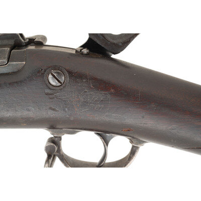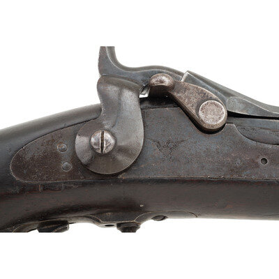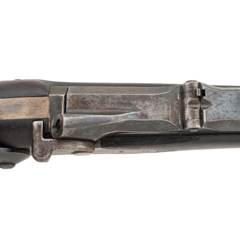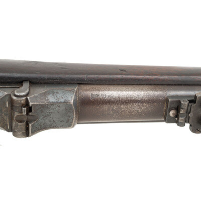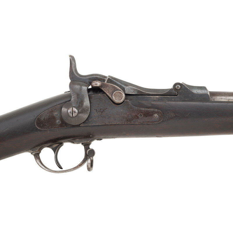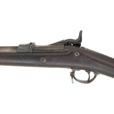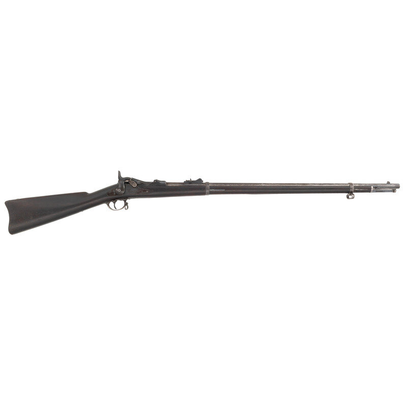 .45-70. 32.5" barrel length. SN: 154703. Blued metal finish with casehardened breechblock set in a walnut straight wrist stock with full length handguard retained by two barrel bands with stacking swivels to the upper band, and a swivel to the two-piece triggerguard. Single-shot trapdoor rifle mounting adjustable ladder rear notch and front blade sights. Rear sight graduated out to 1200 yards and is struck R for rifle. Rifle features a low-arch breechblock struck U.S/MODEL/1873 behind hinge. Lockplate displays the {US Army Eagle} stamp followed by US/SPRINGFIELD. The rifle features a three click tumbler, and mounts a triangular profile ramrod bayonet with 11 grasping grooves in either side and a purpose built forend cap with spring latch. Stock marked with two circle P proofs to the wrist with the left wrist marked with the boxed SWP/1881 cartouche of Samuel W. Porter. Trapdoor buttplate displays standard US marking while both barrel bands struck with U mark. Left barrel is marked V/P/{Eagle Head}/P. One of only 1,001 rifles intended to test the concept of a combination ramrod/bayonet, this rifle falls within the known serial range of 154000-158000. Ultimately, the Army chose not to adopt this solution as standard, but further experiments with the ramrod bayonet were carried out with the Model 1888 and even with the Springfield Model 1903 rifle. {ANTIQUE}