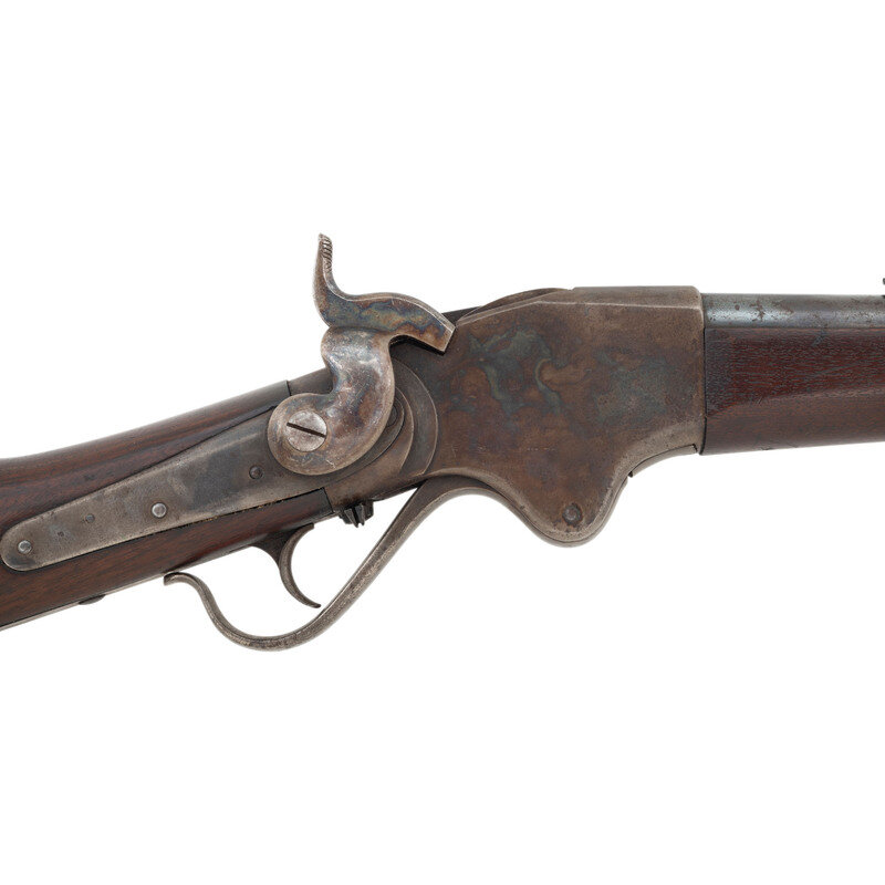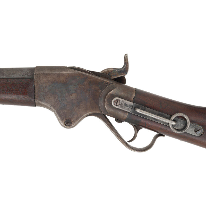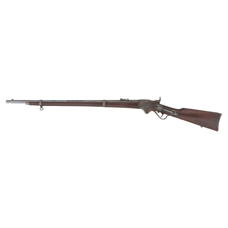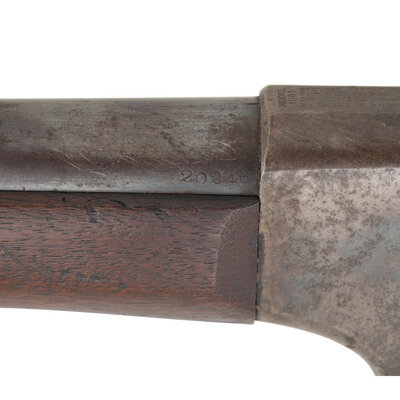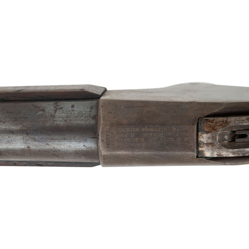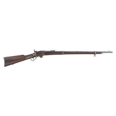 .50RF. 32.5" barrel. SN: 20246. Blued and color casehardened finish, walnut buttstock and forend secured by two solid, spring retained barrel bands. Lever action repeating rifle with butt magazine and follower, arsenal altered from carbine with Stabler cut-off, M1868 ladder rear sight, musket pattern combination front sight and socket bayonet lug, sling swivel on upper barrel band and mount in toe of stock missing swivel, correct grooved base magazine tube follower in butt, no cleaning rod. Standard Burnside Rifle Company M1865 markings on top of receiver, script ESA cartouche to rear of sling bar. Springfield barrel serial numbered to match the receiver. In 1871 the Springfield Armory assembled 1,108 Spencer Infantry Rifles from Burnside contract M1865 Spencer Carbines. During the process the guns had newly made Springfield barrels added to them and they were refinished. {ANTIQUE}