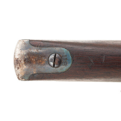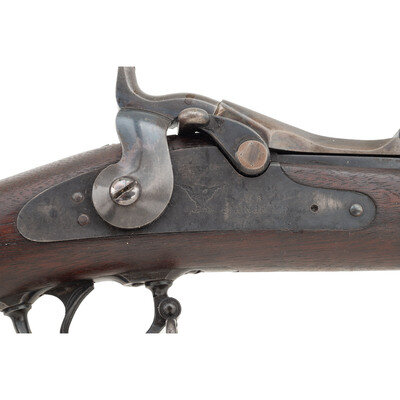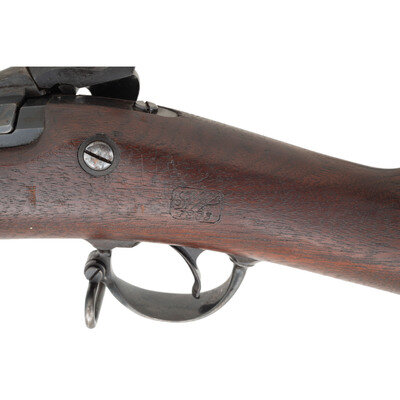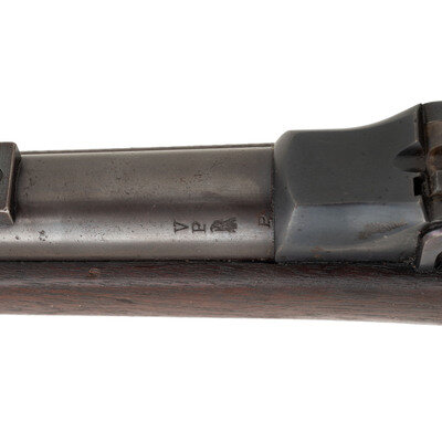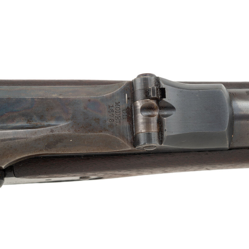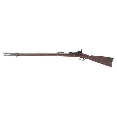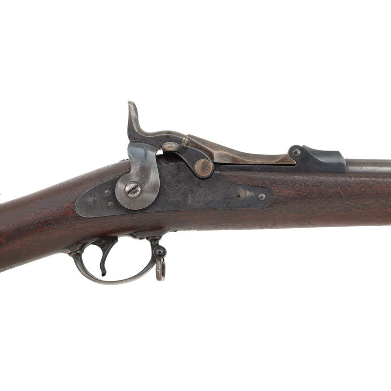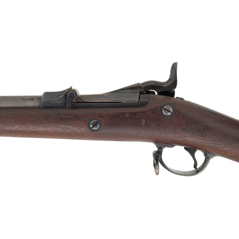 .45-70. 32.5" barrel length. SN: 245186. Mfg. ca. 1883. Blued metal finish with case colored breechblock mounting walnut straight wrist stock with full length handguard retained by two barrel bands. Single shot trapdoor action rifle mounting adjustable R for rifle marked Buffington rear and pinned front blade sights. Muzzle and breech are still in the white. Item features a low-arch breechblock, stacking swivels to upper barrel band, further swivel to the two-piece trigger, and a three click tumbler. Breechblock is marked US/MODEL/1873, correct for early production 1884 rifles. Lockplate struck with {US Army Eagle} followed by U.S/SPRINGFIELD. Left side of the barrel is marked V/P/{Eaglehead} with a further P mark. Wrist exhibits a circle P mark while the left wrist retains a crisp boxed SWP/1883 cartouche for inspector Samuel W. Porter. Both barrel bands display crisp U stamps while the buttplate is struck US. Comes with a blued steel ramrod. {ANTIQUE}