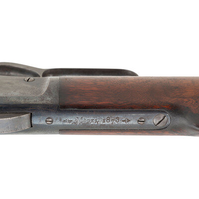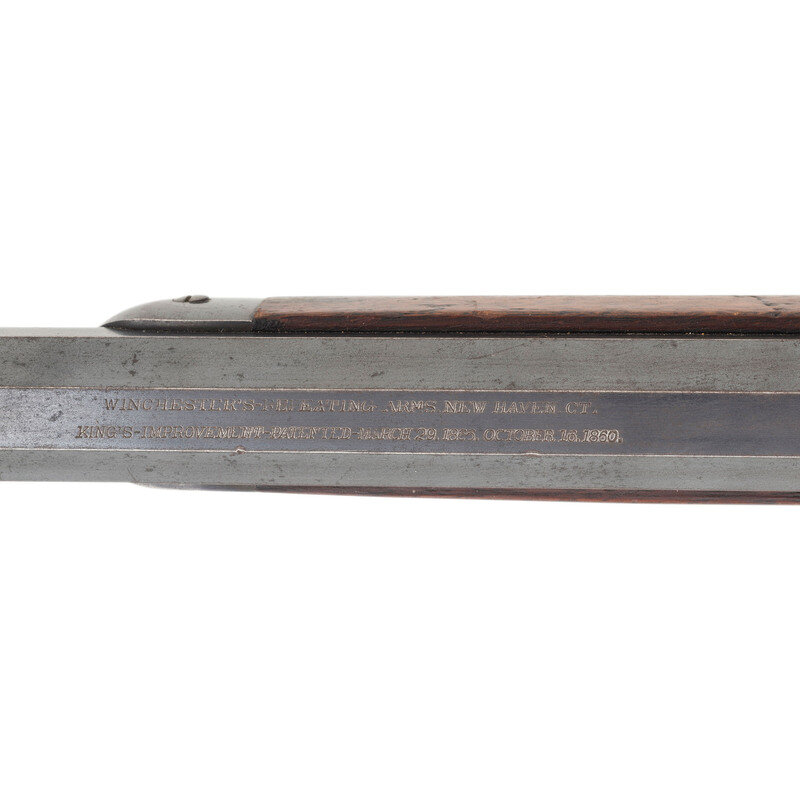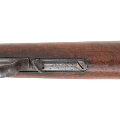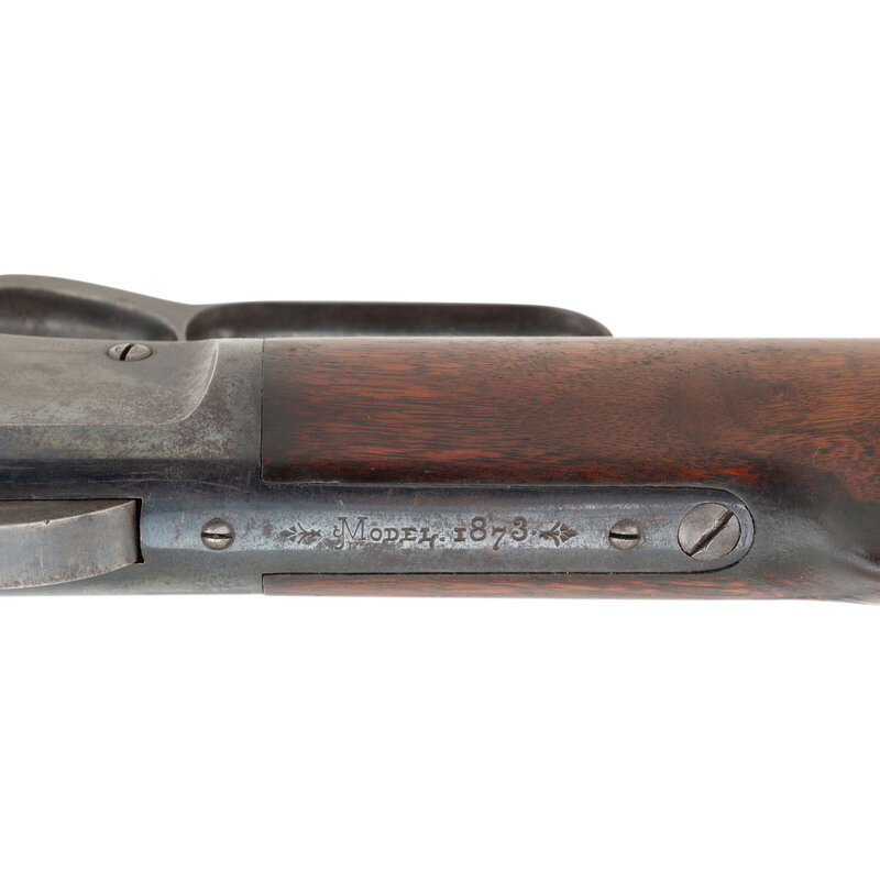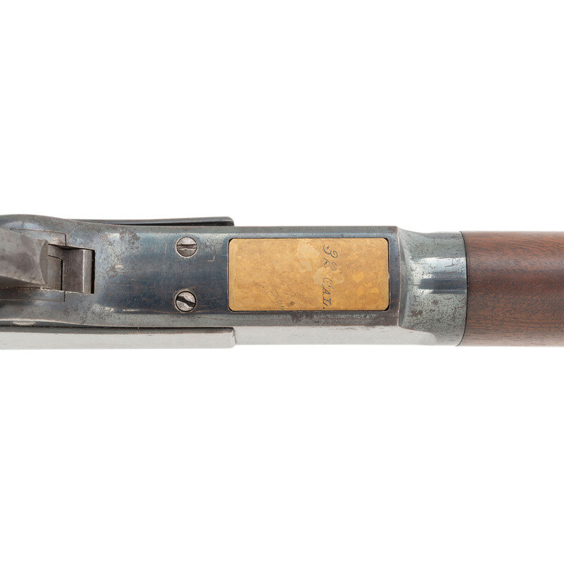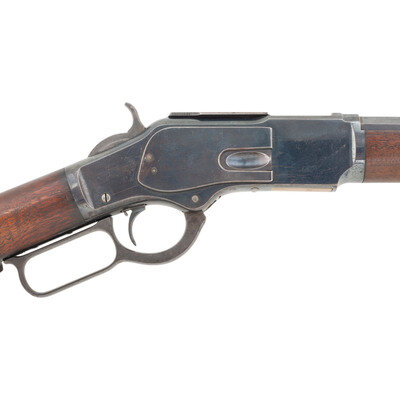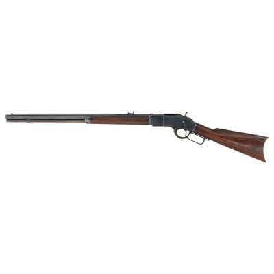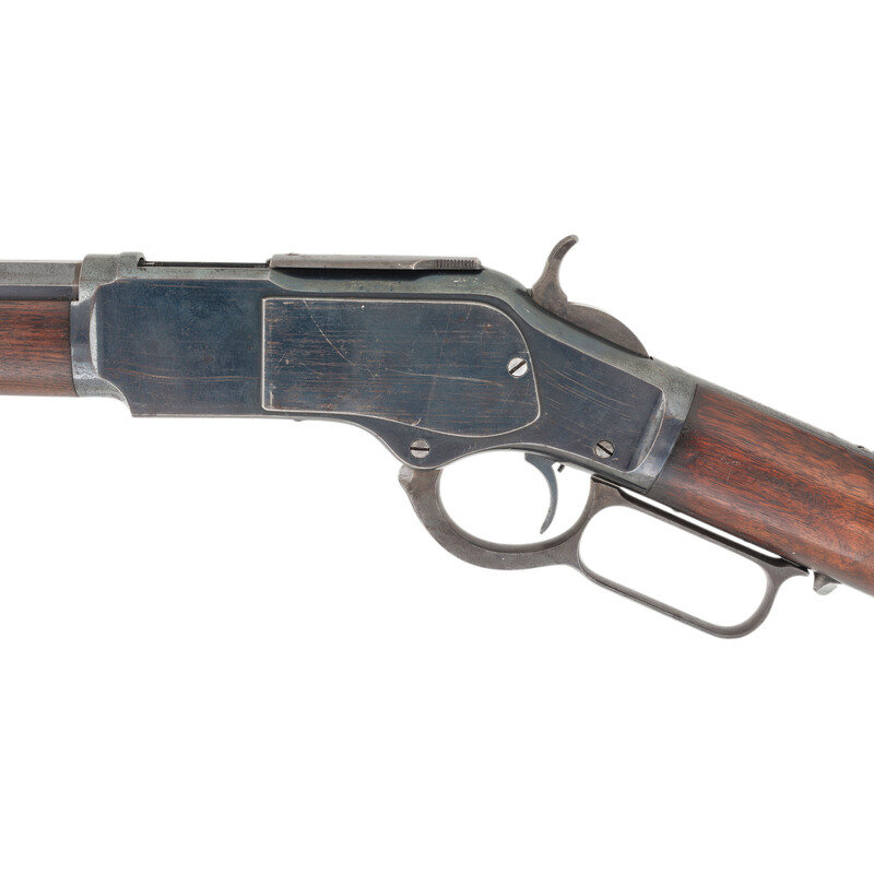 .32-20. 24" octagonal barrel. SN: 166958 (mfg. ca. 1884). Blued finish, color casehardened lever and hammer, brass cartridge lifter, smooth walnut stock with crescent buttplate and smooth forend. Lever action tubular magazine fed repeating rifle with adjustable single set trigger, semi-buckhorn elevation adjustable rear sight, dovetailed blade front sight, machined integral dust cover rail and sliding dust cover. Standard two-line Winchester markings, caliber marking on top of barrel and on bottom of lifter. As it is a .32-20 rifle the butt does not have a trapdoor for cleaning rods. {ANTIQUE}