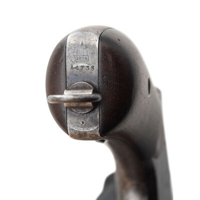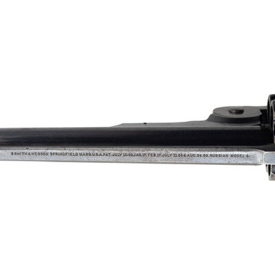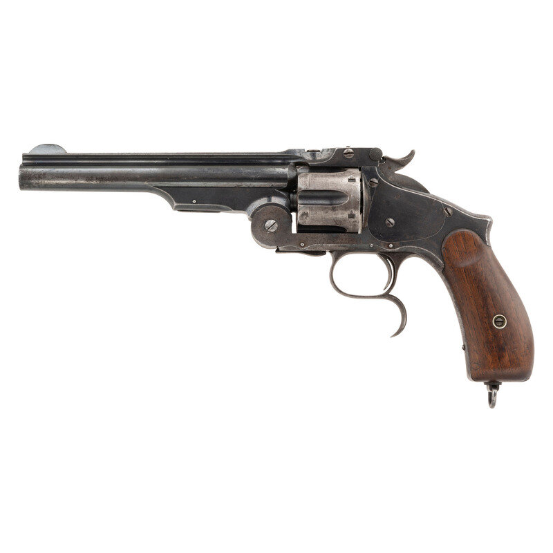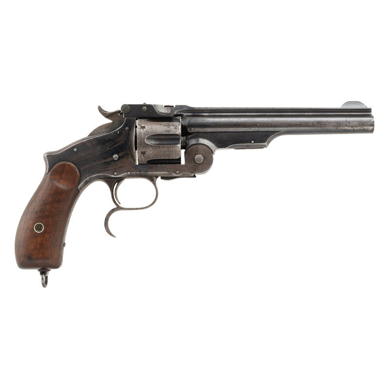 .44 Russian. 6.5" barrel. SN: 44733. Blued finish, color casehardened hammer, smooth two-piece walnut grips. Single action top break automatic extraction revolver with six-chambered fluted cylinder, fixed rear sight on top strap, integral half-moon front sight blade, finger extension on triggerguard and fixed lanyard ring in butt. Barrel with one-line roll mark that reads: +SMITH & WESSON SPRINGFIELD, MASS. U.S.A. PAT. JULY 10. 60. JAN. 17. FEB. 17. JULY 11. 65. & AUG. 24. 69. RUSSIAN MODEL+. Butt stamped with serial number 44733 and the date 1874. Matching serial number stamped in left grip panel. Rear face of cylinder and bottom of frame catch assembly numbered 5613. From the Collection of Charles Worman, co-author of the two volume set Firearms of the American West. {ANTIQUE}
