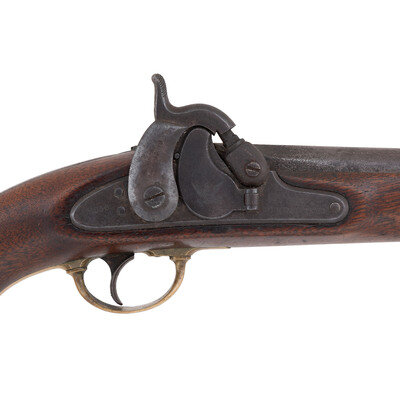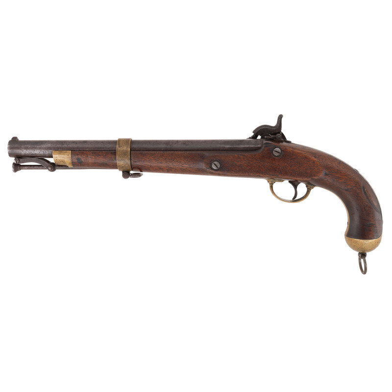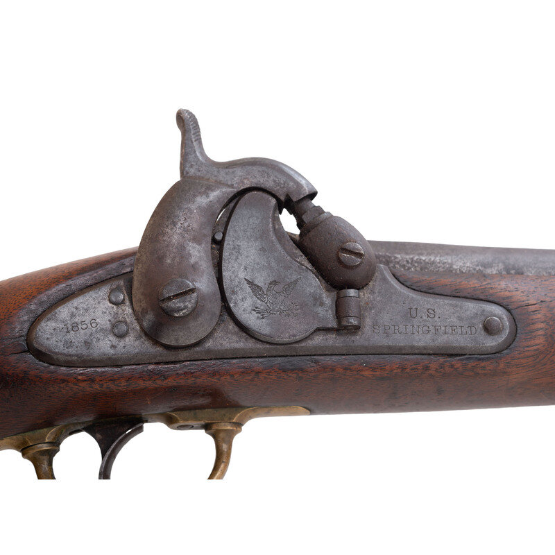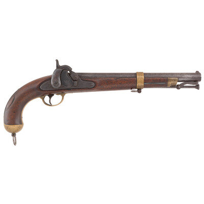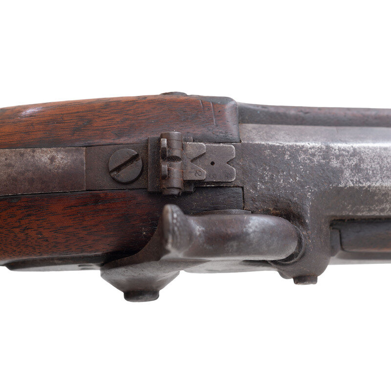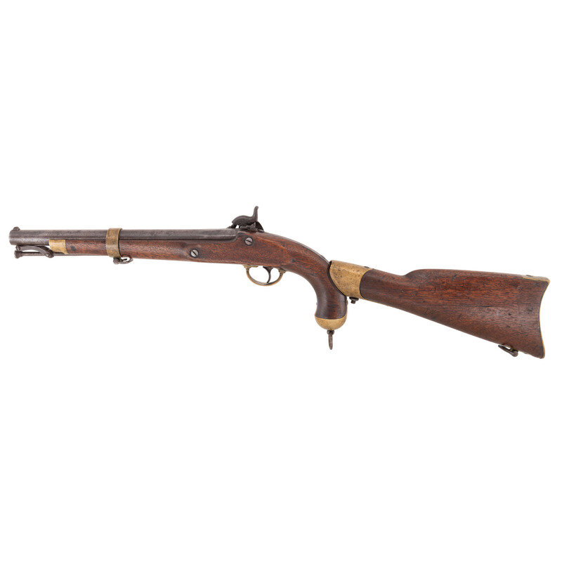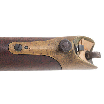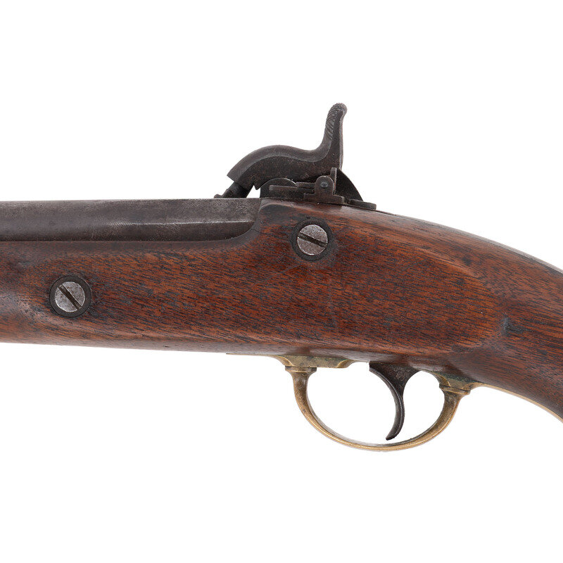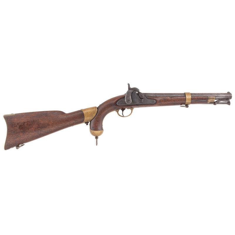 .58 caliber. 12" barrel. NSN. Bright finish, brass furniture, walnut stock. Single shot percussion muzzleloading pistol carbine with Maynard's patent automated priming lock and captive swivel ramrod. Lock marked U.S./SPRINGFIELD at the front and dated 1856 at the rear, with a {Spread-Winged American Eagle} on the primer magazine door. Left angled breech flat with small V/P/{Eagle Head} inspection marks and dated 1855 on top, under the rear sight. No cartouches are present on the counterpane. The rear of the butt cap has the batch mating number 5 on it. Pistol retains the original folding leaf rear sight and musket style front sight, sling ring in butt and sling swivel on barrel band. The pistol carbine is accompanied an original detachable stock complete with the attachment yoke and swivel in the toe. These stocks are less often encountered than the pistol carbine itself. The top of the buttplate tang is marked US and the yoke has a partially legible batch mating number that may be 5.