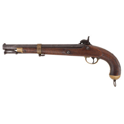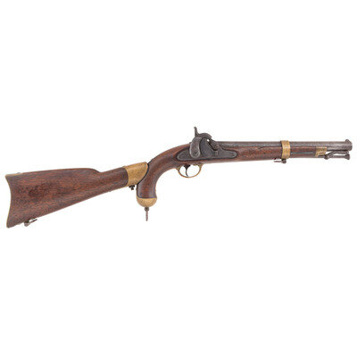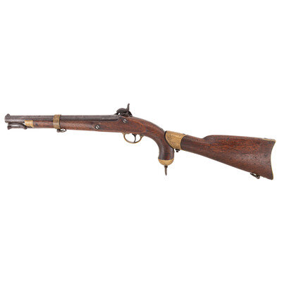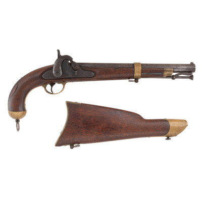 The US Model 1855 Pistol Carbine was a European inspired idea that mated an overly long and ungainly handgun with a detachable stock, creating a poorly handling pistol or a short carbine with a wobbly stock. As such, the design was not particularly popular with the men they were issued to. Only 4,021 of these ungainly and relatively unpopular pistol carbines were produced at Springfield between 1855 and 1857 and today they are relatively scarce, especially with an original stock. {ANTIQUE}
