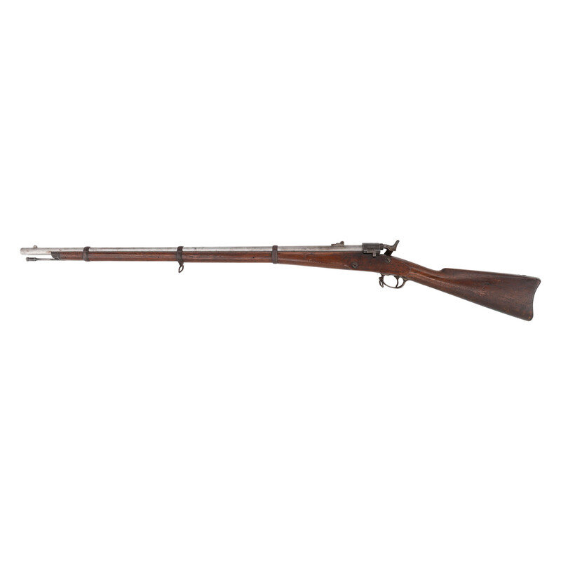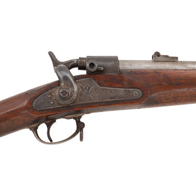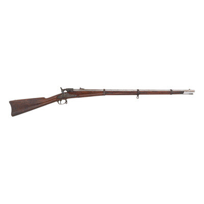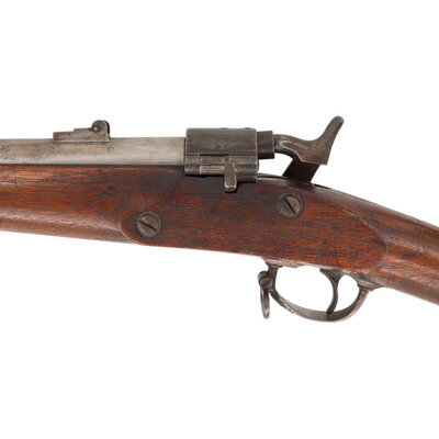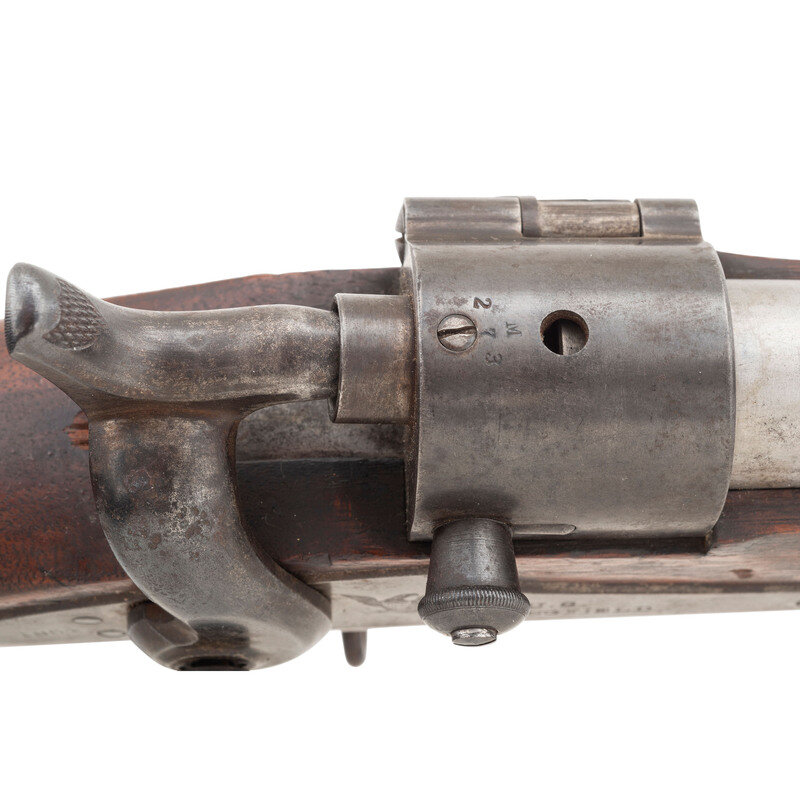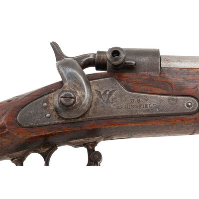 .50RF Joslyn. 35.5" barrel secured by three solid, spring retained barrel bands. SN: 273. Bright finish, casehardened breech block, iron furniture, full length walnut stock. Single shot breechloading metallic cartridge rifle with M1864 rear sight, combination front sight and socket bayonet lug, sling swivels on the triggerguard bow and middle band and a jag head cleaning rod. Lock with {Spread-Winged Eagle} and U.S./SPRINGFIELD forward of the hammer and dated 1864 horizontally at the tail. Breech block and tang with matching serial number and M sub-inspection, no patent markings on breech block. No visible cartouches. Only 3,007 of these rifles were produced at Springfield Armory circa 1865 with slightly more than half later altered to .50-70 centerfire. This example remains in its original rimfire configuration. These rifles were the first metallic cartridge breechloading long arms produced at the Springfield Arsenal. {ANTIQUE}