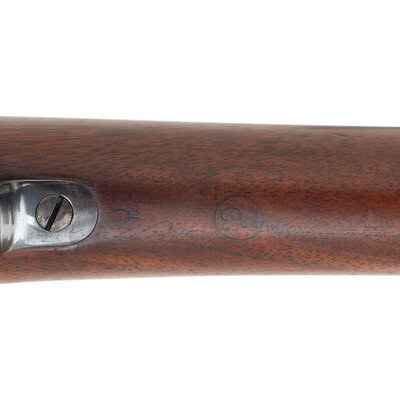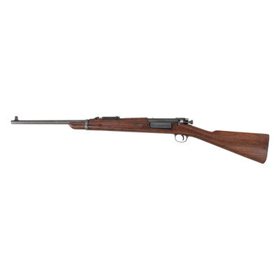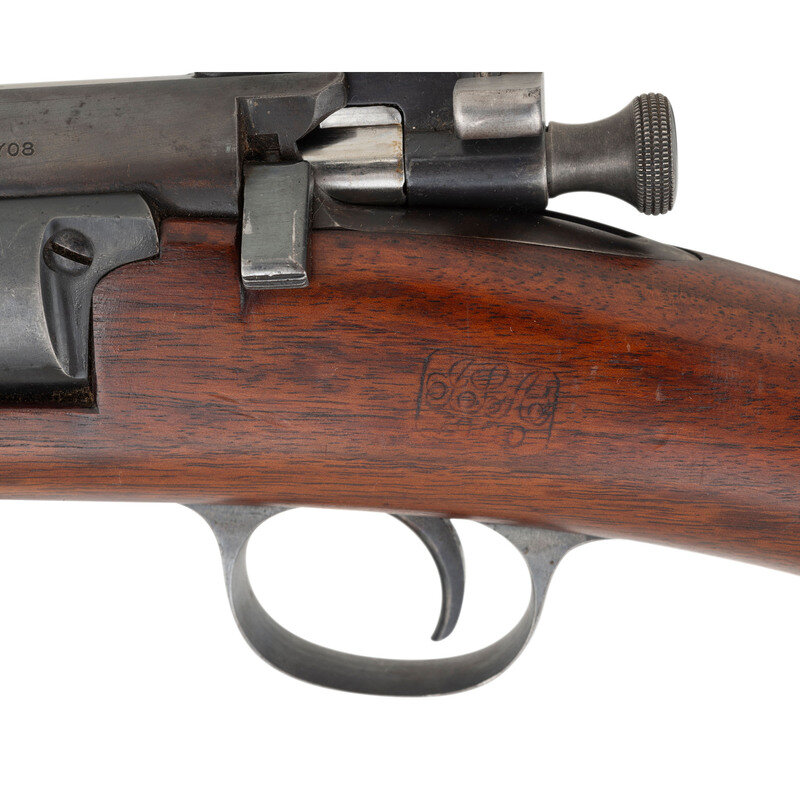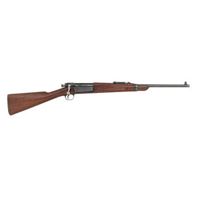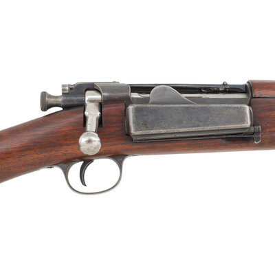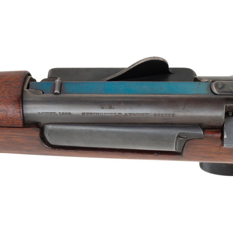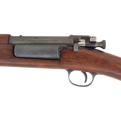 .30-40. 22" barrel length. SN: 281708. Blued metal finish with polished bolt body and handle, nitre blue extractor and buttplate trapdoor mounting walnut straight wrist handguard with half length forend. Bolt action internal magazine fed repeating rifle charged via a loading hatch to the right receiver. Sights consist of an adjustable rear ladder adjustable from 100 to 2300 yards paired with a pinned front blade. Manufacturer mark to left receiver reads U.S./SPRINGFIELD ARMORY. with model mark reading MODEL 1899. Rear sight base displays a correct C for carbine mark, and the left wrist correctly lacks a saddle bar and ring. Barrel band displays a U mark to the right side. Wrist struck with circle P proof mark. Left wrist shows a boxed JSA/1900 inspector's cartouche of inspector Joseph S. Adams, the correct marking for a Krag of this vintage. Serial number likewise corresponds to 1900. Rear sight is the 1901 pattern, and shows a C stamp to the left side of the notch. Item also features the standard Krag cocking piece rather than the knurled headless type. Stock contains three piece cleaning rod and nickel plated oiler. {C&R}
