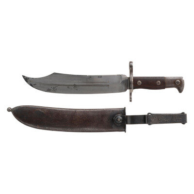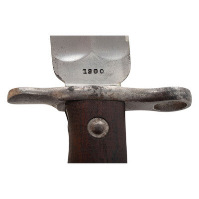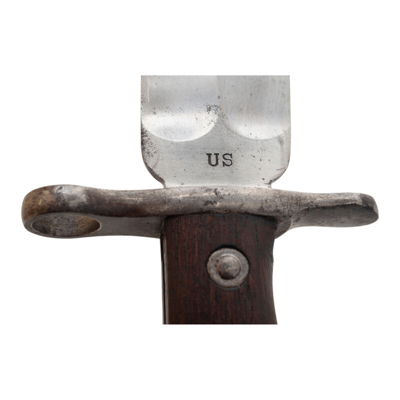 9" single edged clip point Bowie blade with 2.625" false edge and prominent median ridge. Blade 1.75" wide at widest point and 1.5" wide at ricasso. Overall length 13.5". 4.5" standard Krag pattern hilt with iron cross guard and pommel cap, push button lug latch and riveted smooth walnut grip scales. Obverse ricasso marked US and reverse ricasso dated 1900. Includes a blued steel scabbard with belt hanger. Sources vary as to the total of these bayonets being produced for the Krag Rifle in the wake of the Spanish American War. Numbers quoted as between 2,000 and 2,800. Supposedly 500 were sent to Cuba for field testing, while the bulk of the bayonets, some 1,500 were sent to the Philippines. A rare US bayonet not often seen for sale.