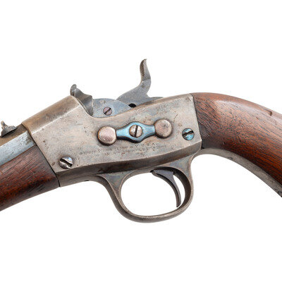 .22RF. 10" octagon to round barrel. NSN. Blued and color casehardened finish, walnut grip and stock. Single shot rolling block action pistol remanufactured as a .22RF sporting pistol with a newer barrel and likely refinished when altered. Standard Remington receiver markings and P/F.C.W. US Navy inspection on right of frame. Replaced barrel with dovetailed notch rear sight and blade and base front sight. No barrel markings. A nice alteration of a M1867 Navy Rolling Block pistol to .22 likely from the first quarter of the 20th century. {MODERN}