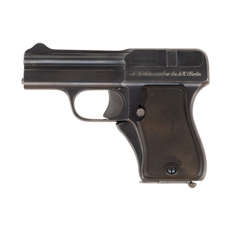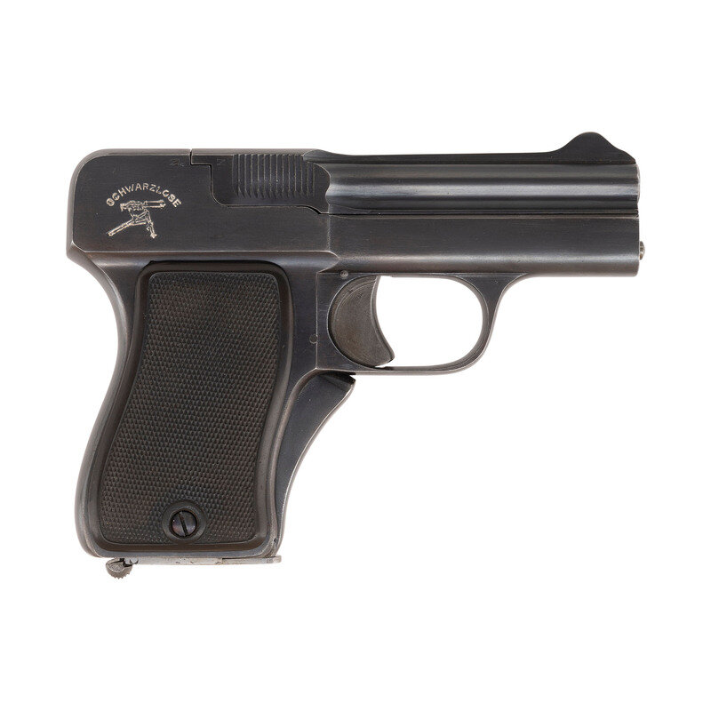 7.65mm. 4.125" barrel. SN: 3005. Blued finish, checkered hard rubber grips. Single action striker fired blow forward fixed barrel pistol with front strap grip safety, slide notch rear sight, fixed front sight and heel magazine release. This pistol was professionally restored by Gale Morgan. Crown/N proofs on right side of frame and slide. Schwarzlose machine gun logo is present on the right rear of slide and the pistol is further marked in script on the left side of the frame A.W. Schwarzlose GmbH Berlin. A single magazine is included.