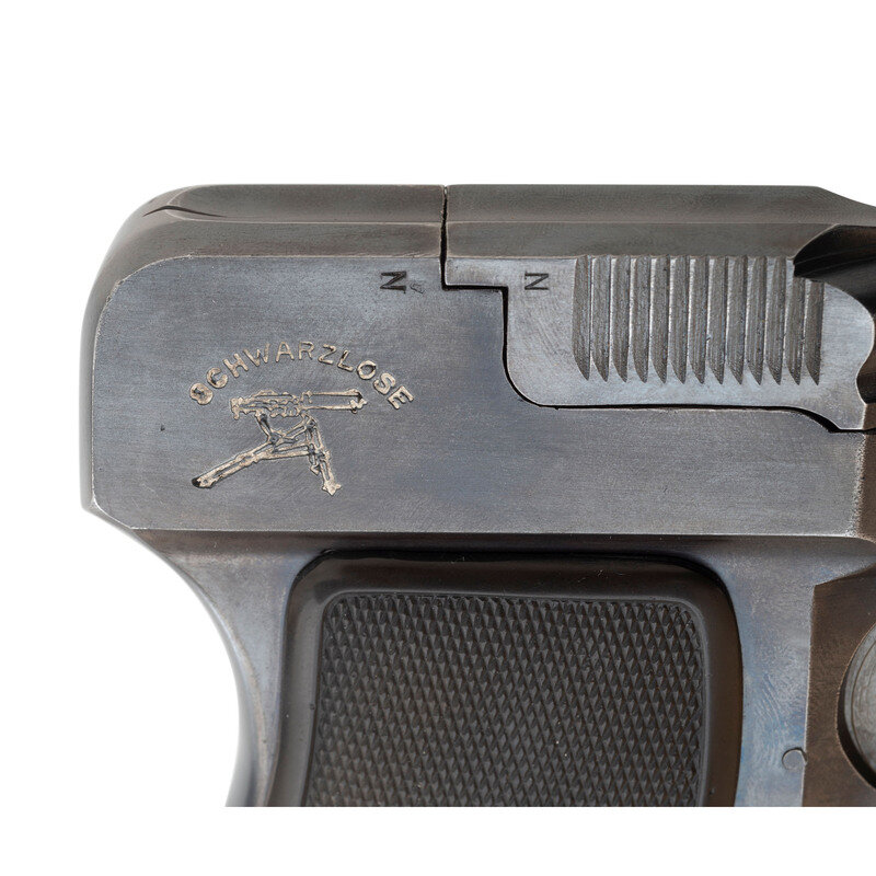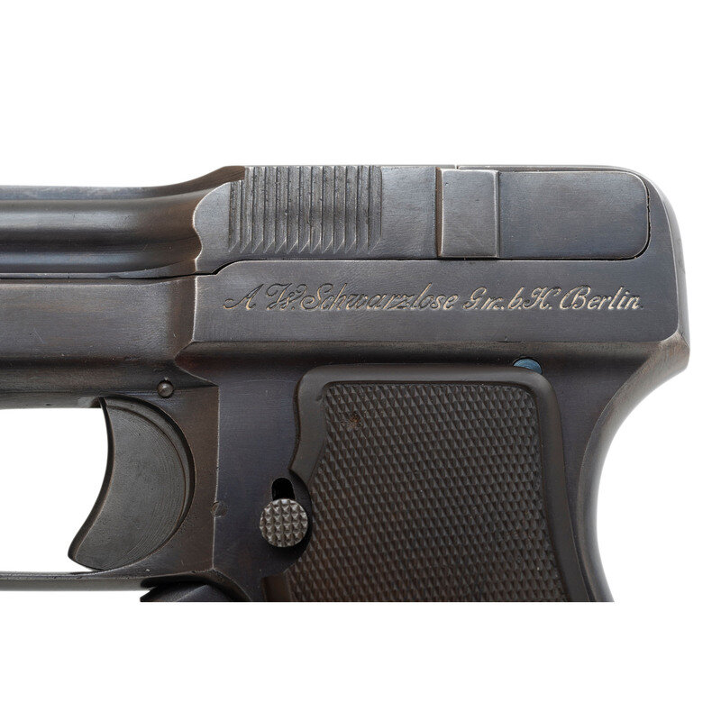 One of only three known commercially available blow-forward action pistols, Andreas Schwarzlose patented this design in 1908. Known mostly for his M1907 and M1907/12 machine gun designs, Schwarzlose only produced this pistol model from 1908 to about mid 1910. Despite its unusual design that reportedly caused sharp recoil and safety concerns, the 1909 was a minor success and sold about 8,000 pistols before Schwarzlose declared bankruptcy. According to Der Waffenschmied (a German weapons newsletter), Schwarzlose locked his factory doors in response to worker strikes and went bankrupt around May 1910. Schwarzlose's stock of pistols was later bought by G.C. Dornheim G.m.b.H. and sold for extremely low prices according to an October 1910 issue of Der Waffenschmied. It is speculated that most of the pistols after serial number 3541 were not proofed until sometime in 1912 after Schwarzlose had already relinquished control of the company. Early examples are often seen with Crown/B or Crown/U proofs and fully checkered grips. The Crown/N proof was not used until 1912, and most late models will have 2/3 checkered grips. In some advertisements from around 1913-1914, there are modified Model 1909's found listed as "Warner Schwarzlose" pistols sold by the Warner Arms Corporation in New York City. {C&R}