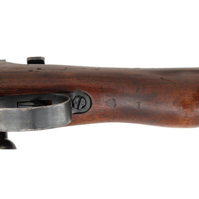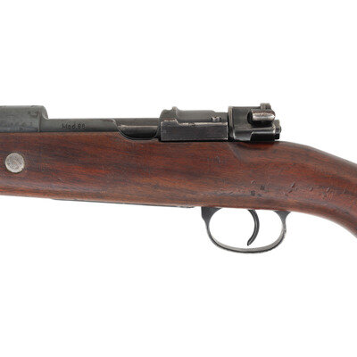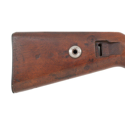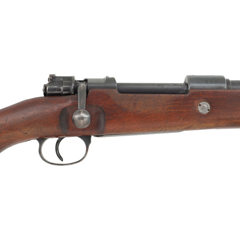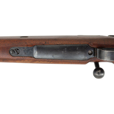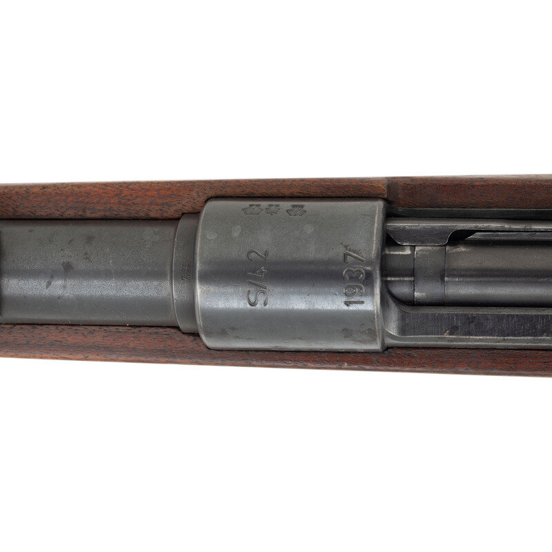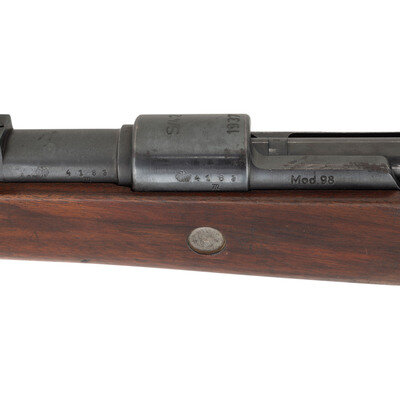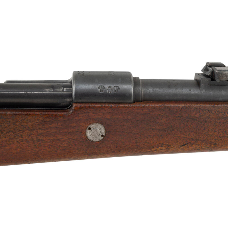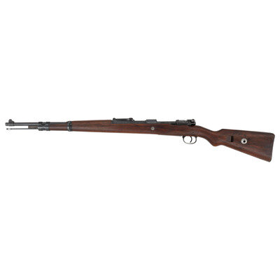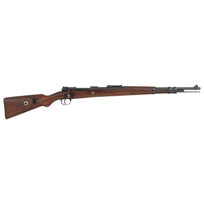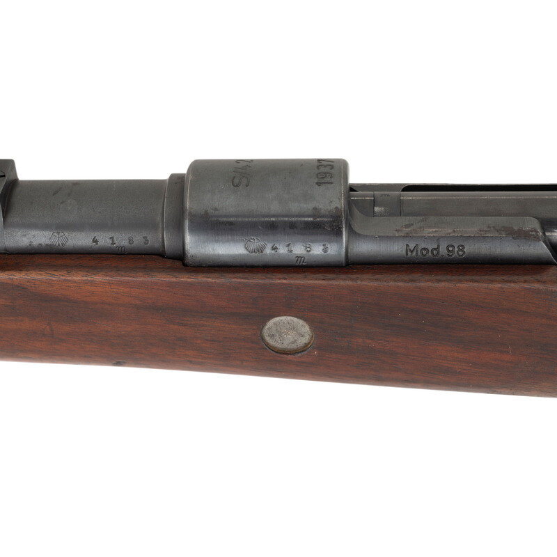 7.92x57mm. 23.62" barrel length. SN: 4183m. Blued metal arsenal refinish with walnut semi pistol grip stock and half length upper handguard. Bolt action internal magazine fed repeating rifle with pre-war production marks and droop eagle stamps. Receiver struck with S/42 marking for Mauser production rifles, and a date of 1937. Model marking to left receiver reads Mod. 98. Sights consist of a tangent rear notch adjustable from 100 to 2000 meters paired with an inverted V front sight on matted ramp. Serial numbers match on all parts. Item displays the {Droop Eagle} mark to the left receiver and left barrel. {Droop Eagle/63} waffenamt stamp in three places on right receiver, twice on the wrist, twice on right butt, and two places on the toe of the stock. Further {Eagle/WaA63} waffenamt marks appear on all major parts except bolt components. Bolt displays {Eagle/280} markings to parts. Right butt struck {WWII German Eagle/H} Heer marking. No visible import marks. Barrel gauge reading of 7,91 struck into the shank. Cleaning rod unmarked. {C&R}