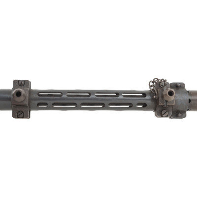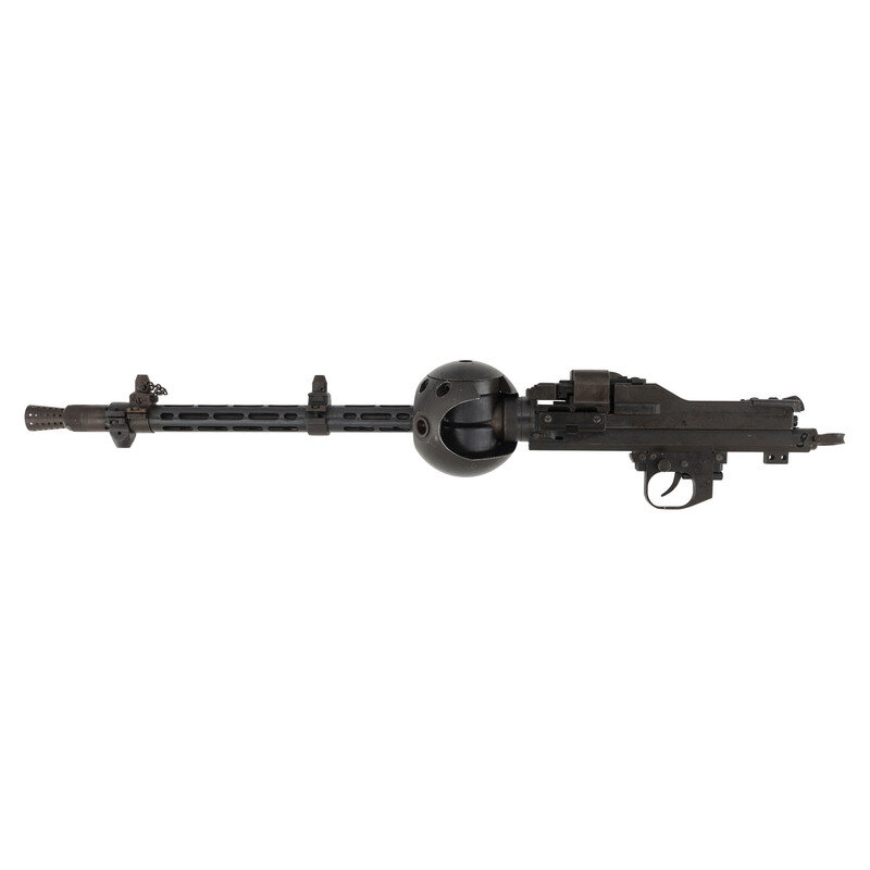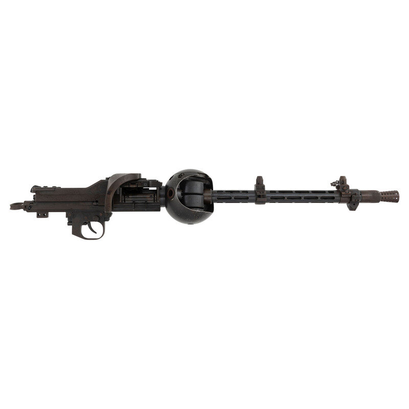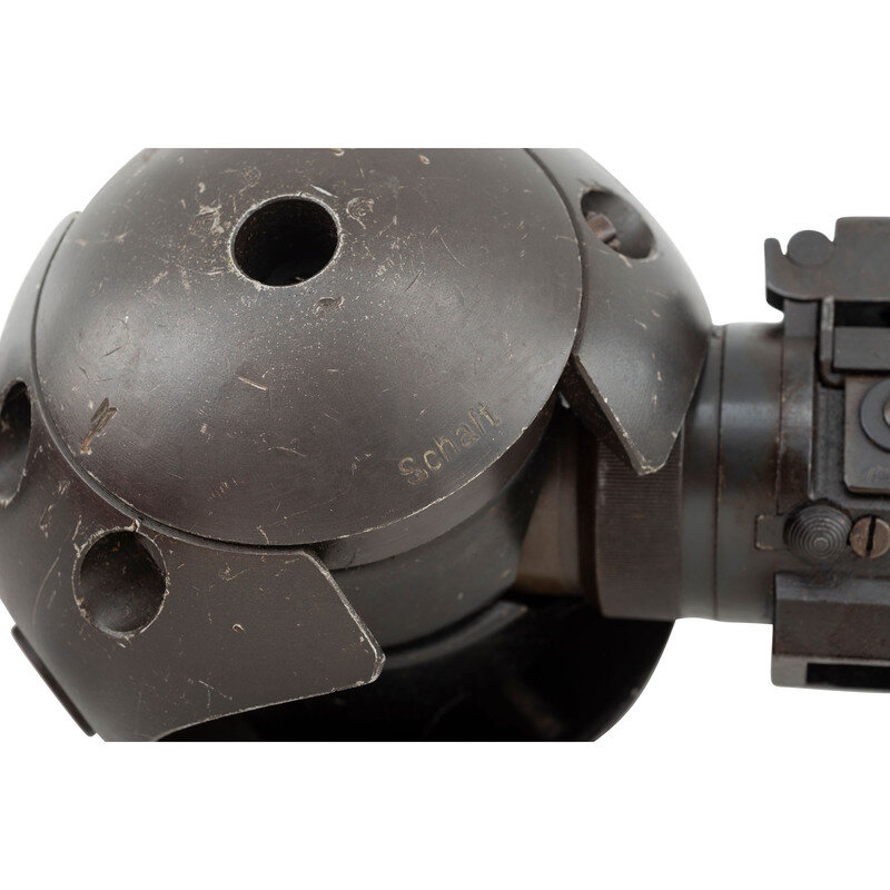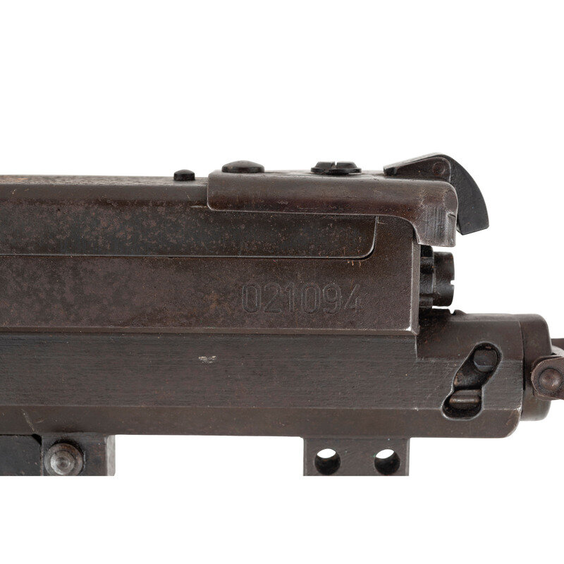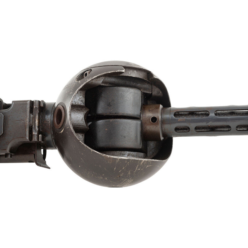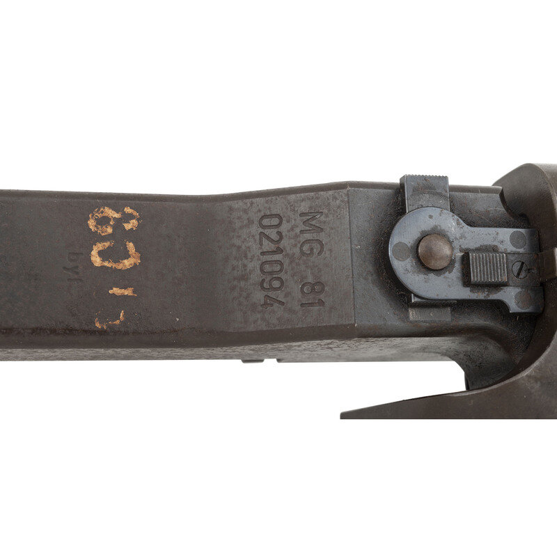 7.92x57mm. 18.7" barrel length. SN: 021094. Blued metal finish with gray barrel shroud mounted in a World War II German Lagerfugel, or aircraft ball mount. Deactivated short-recoil operated muzzle boosted belt-fed machine gun intended for aircraft service. Cover assembly shows model marking MG 81 followed by the serial number and byf factory code indicating it was manufactured by Mauser-Werke. Item additionally shows an applied painted rack number of 80 with two illegible digits following. Empty belt guide struck with an R initial above a {Droop Wing Eagle} with additional nonmatching serial of 602. Further {Droop Wing Eagle} mark visible on rear cover assembly. Ball mount marked LK 140/81/FI203694 in addition to Eagle stamps, a Luftwaffe mark, BAI/28 mark, and {B in shield} mark. Item has been deactivated by welding a plug into the feed ramp. It is also incomplete, and lacks the bolt, return spring, firing pin spring, pistol grip, sights, etc.. The cocking handle is frozen due to the welding. Item fitted for right hand feed.