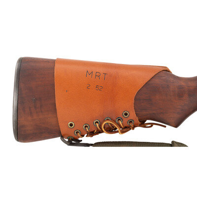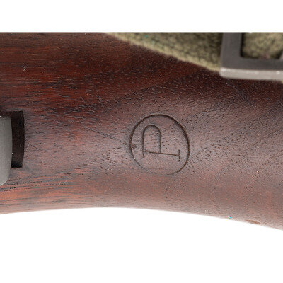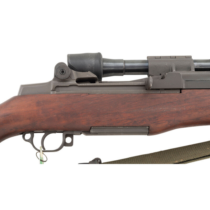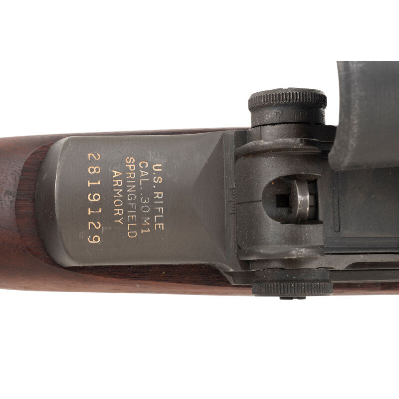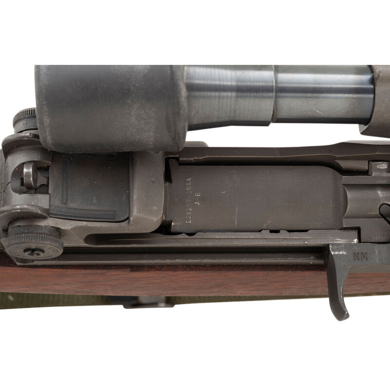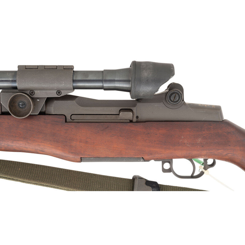 .30-06. 24" barrel length. SN: 2819129. Parkerized metal arsenal refinish set in walnut semi-pistol grip stock and mounting an M84 telescopic sight to an M1D pattern scope base. Long stroke piston driven semi-automatic sniper rifle charged with en bloc clips. Rifle mounts T105 pattern rear aperture sight paired with a front blade with protectors in addition to the scope. Receiver marking reads U.S. RIFLE/CAL. .30M1/SPRINGFIELD/ARMORY, with the serial number corresponding to May, 1944 production. Barrel displays two P proofs, one additionally punch dot marked, and is dated S-A-9-52, indicating it was likely rebuilt as a sniper rifle in 1952. Scope base is unmarked, as is typical for M1D sniper rifles. Scope bracket shows a circle M mark to the left side, and a correct rough finish with polished connection surfaces, countersunk screws, and the right screw does not pass completely through the bracket. Scope mounts a plate reading TELESCOPE/M84/SERIAL NO. 30951, rubber eyepiece, sun shroud, and protective caps for the turrets. Trigger housing is marked D28290-14-SA, bolt struck D28287-19SA/A-6, and the replaced operating rod is radius cut and marked 7790722-RA, with a further NM marking for National Match, suggesting it may have been replaced since it was surplussed by the government. Stock mounts a leather cheek pad struck MRT/2 52 on the right side, and features leather laces with brass grommets. Flash hider marked HIDER FLASH M2/THE HART MFG. CO. Stock void of tools. Comes with a canvas Nobuckl sling. Item comes with government bill of sale, a list of accoutrements, and a letter from CMP to club leaders informing them of the procedure to request M1C and M1D rifles. {C&R}