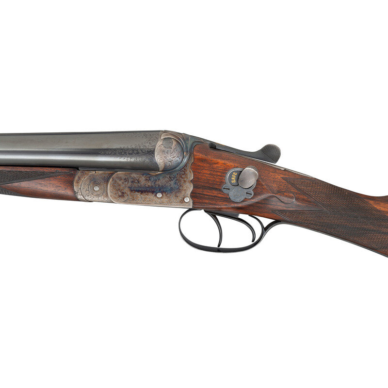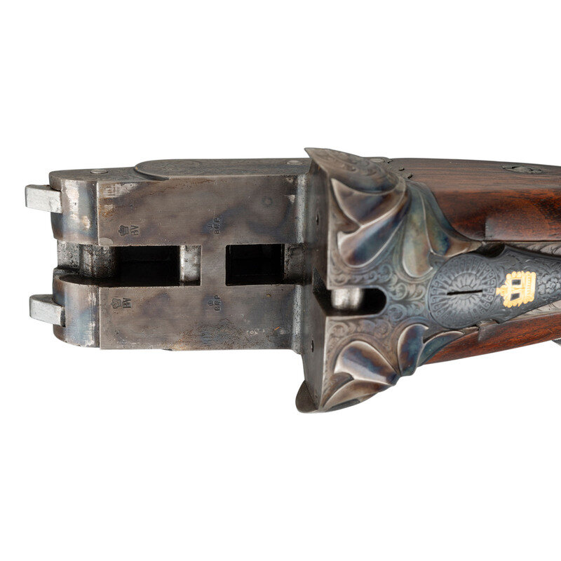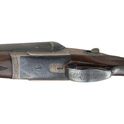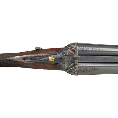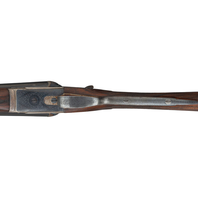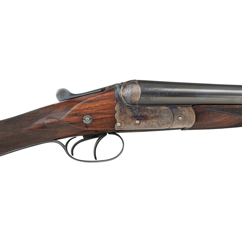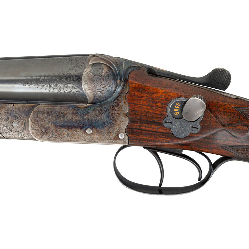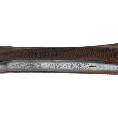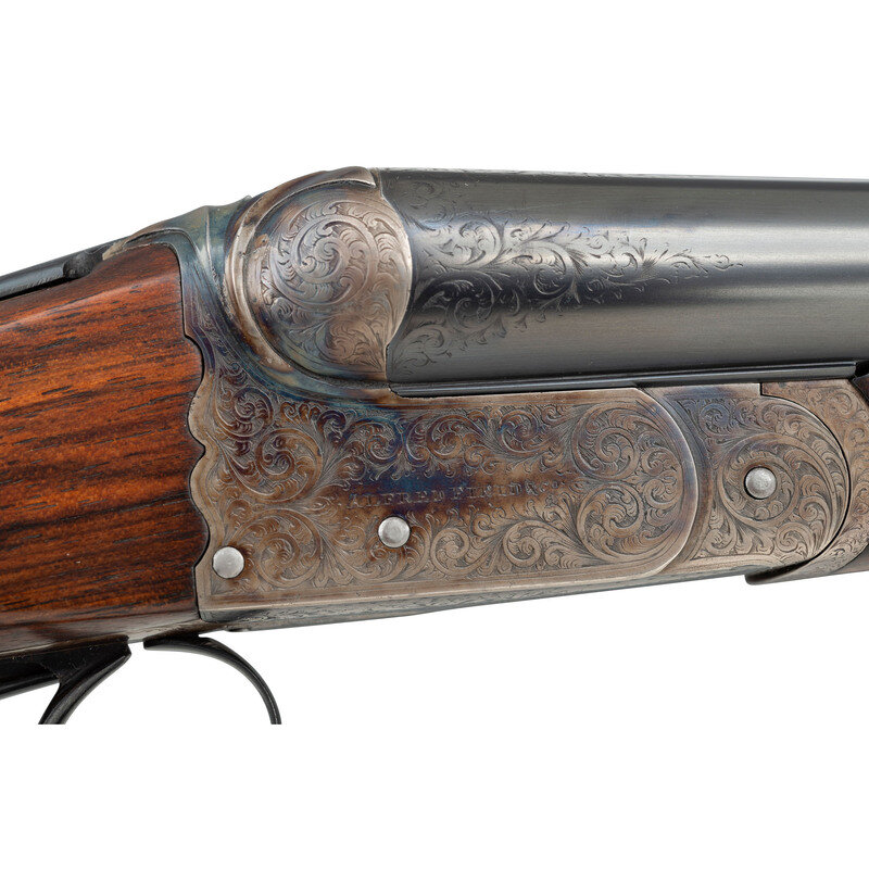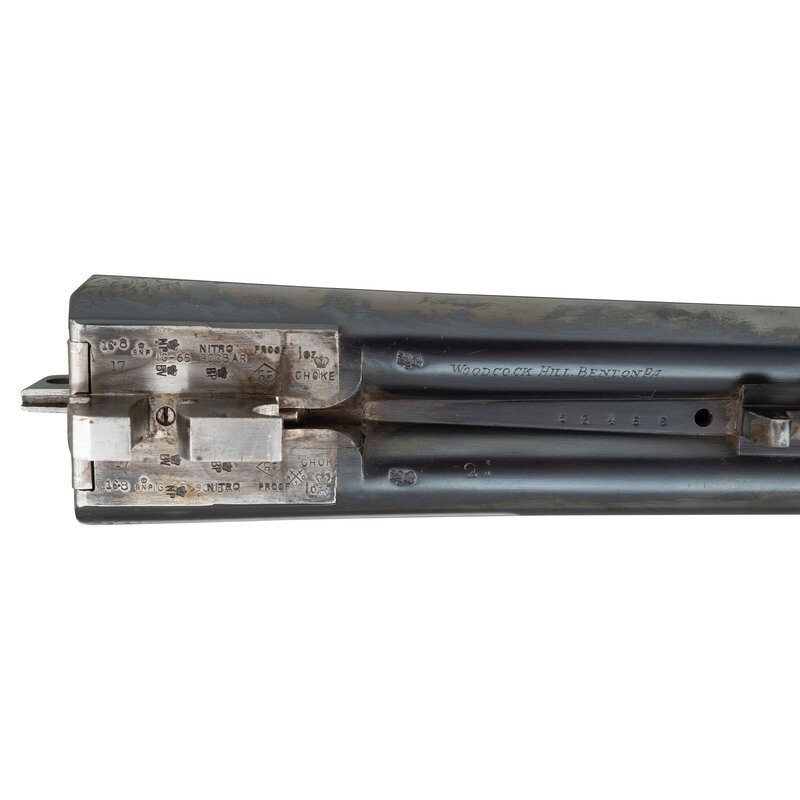 16 Gauge. 26.875" barrel length. SN: 52456. 2.75" chamber lengths. Modified Left. Improved Cylinder Right. Blued finish with casehardened frame in walnut stock with silver oval plate and a leather wrapped butt. Double barrel side by side boxlock extractor shotgun featuring walnut straight English stock with splinter forend, and a Greener style side safety to the left wrist. Matted barrel rib mounts a single front bead sight and shows the maker marking ALFRED FIELD & CO. BIRMINGHAM & LONDON with both frame flanks additionally marked ALFRED FIELD & CO. Serial numbers match on the barrel flats and watertables, but the forend serial number was obliterated during restoration. Watertables show multiple generations of Birmingham firing proof marks indicating it was reproofed after restoration. Left barrel is engraved WOODCOCK HILL, BENTON PA, for a retailer specializing in new and used mid-range English arms. Shotgun features spiral scroll engraved enhancements over the frame and small parts with border scroll on the barrels, and a gold inlaid crown on the lever. Metal fits slightly proud but the wood retains crisp details, suggesting it may have been sanded and then retouched. 14.5" length of pull. 1.625" drop to comb. 2.5" drop to heel. {C&R}