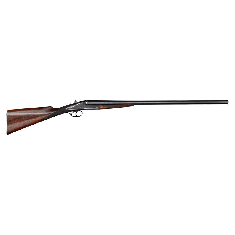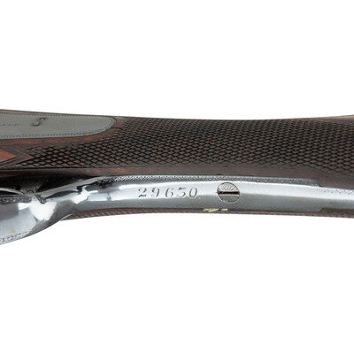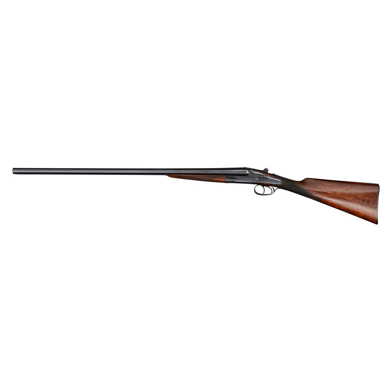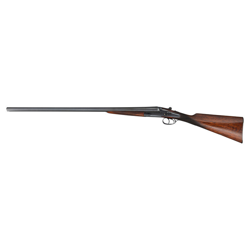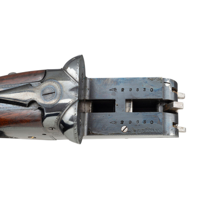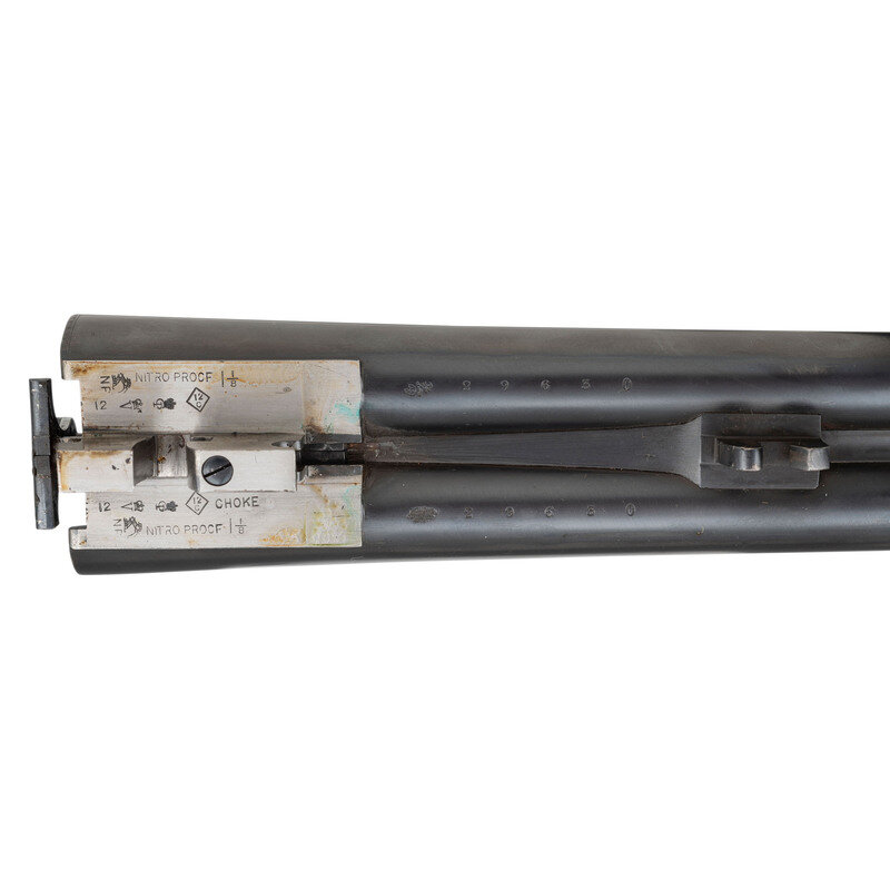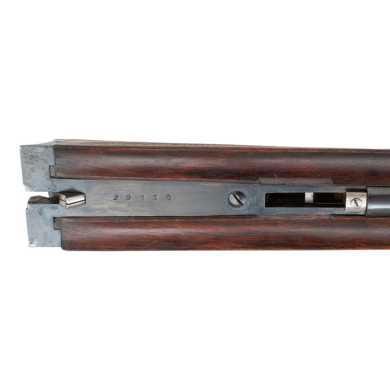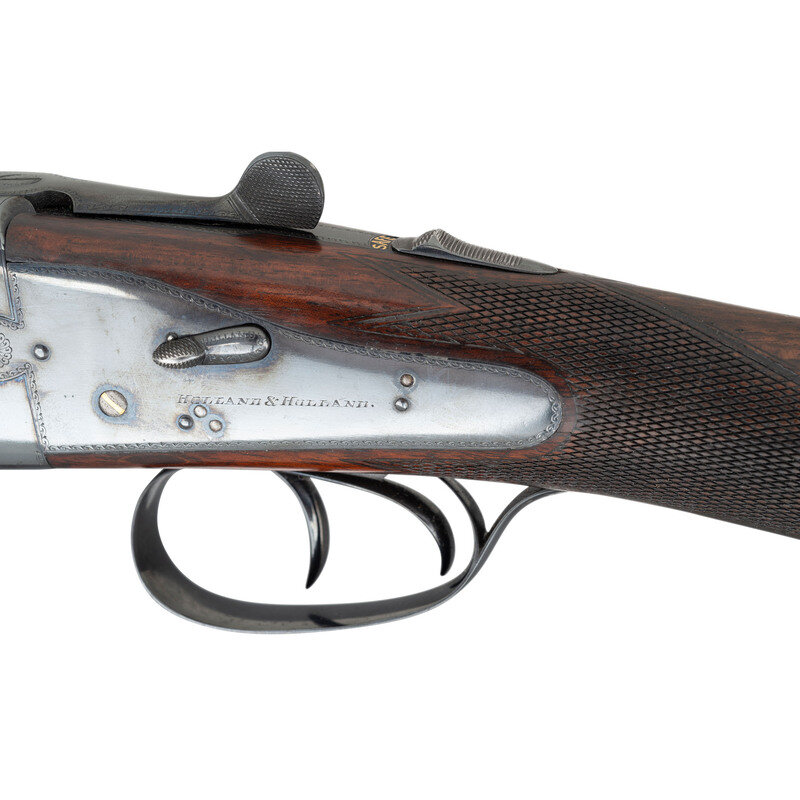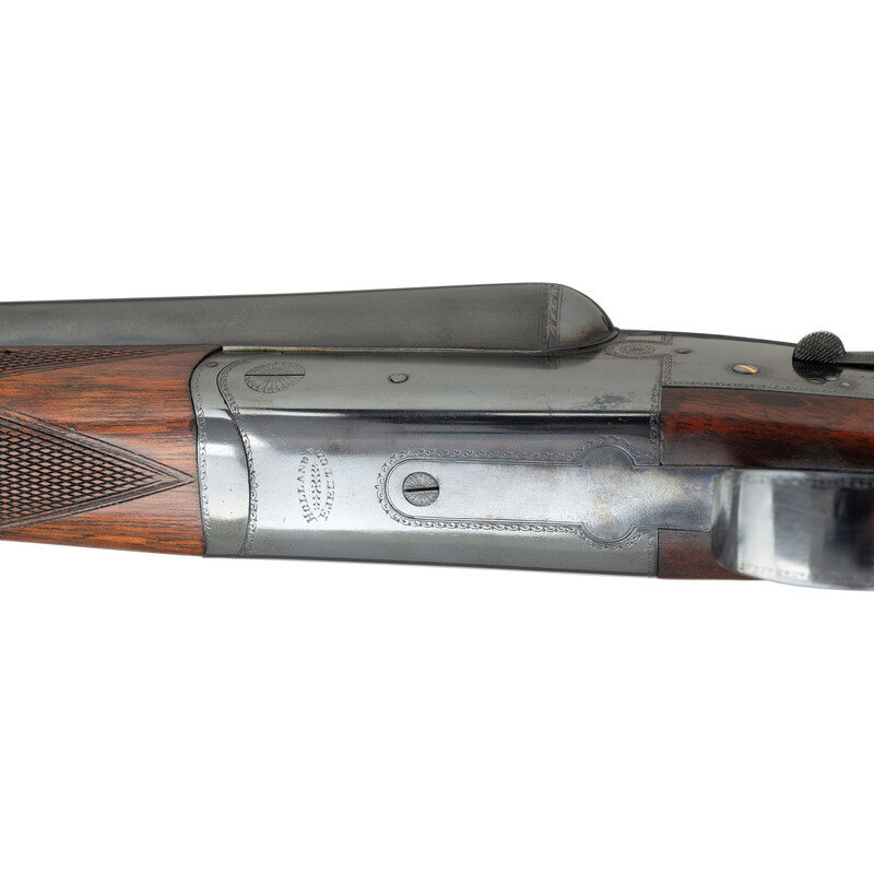 12 Gauge. 30.0625" barrel length. SN: 29630. 2.625" chamber lengths. Modified Left. Cylinder Right. Blued metal refinish overall with polished barrel flats, single bead sight on concave barrel rib, and straight English style stock with bordered multipoint checkering to wrist and splinter forend. Double barrel side by side back action lock ejector shotgun with hand detachable sideplates featuring HOLLAND/PATENT marked takedown screw. Both sideplates display engraved HOLLAND & HOLLAND maker markings. Right barrel engraved HOLLAND & HOLLAND, and the left exhibits the address 98, NEW BOND STREET, LONDON. Barrel flats and watertables show London nitro proof markings. Serial numbers match on the barrels, frame, triggerguard, and forend. 14.5" length of pull. 1.5" drop to comb. 2.5" drop to heel. {C&R}