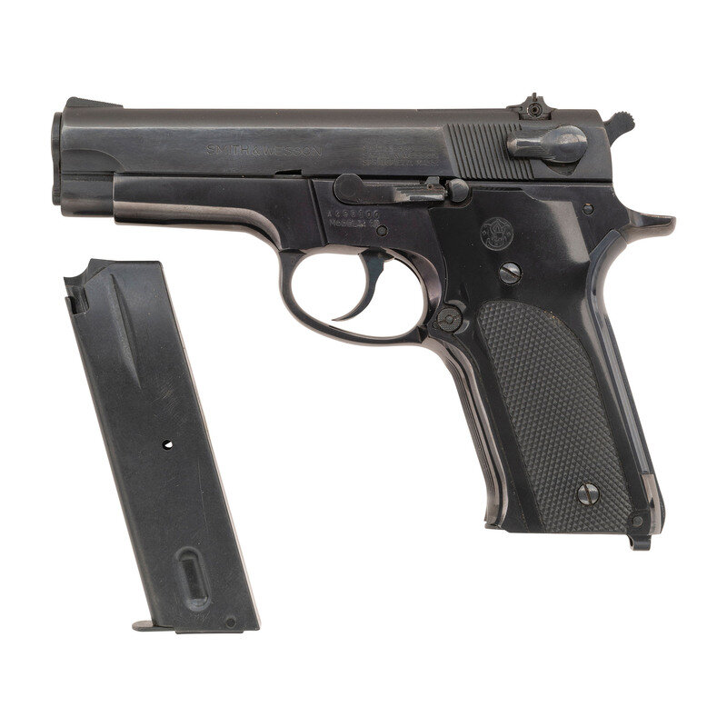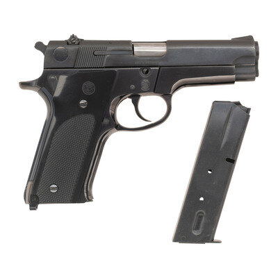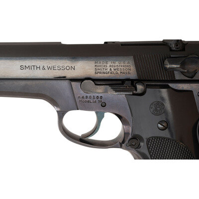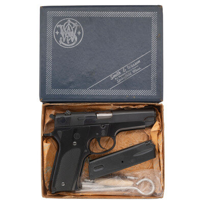 9mm. 4" barrel. SN: A490100. Blued finish, bright barrel, checkered nylon Smith & Wesson logo grips. Conventional double action tilting-barrel short recoil semi-automatic pistol with adjustable square notch rear sight, serrated ramp front sight, slide mounted safety/de-cocker lever, grooved backstrap, internal magazine disconnect safety and lanyard loop in butt. Reverse of slide with four-line marking reading MADE IN U.S.A./MARCAS REGISTRADAS/SMITH & WESSON/SPRINGFIELD, MASS near the safety and with a larger SMITH & WESSON marking further forward. Left of frame marked with the serial number and MODEL 147A below the slide release. The "1" and the "A" are hand stamped and applied in front and behind the original model "47" designation. Obverse of slide marked PAT'S PENDING and obverse of frame with Smith & Wesson logo stamp. The pistol is accompanied by a total of two blued 9MM and S&W marked double-stack factory magazines and the original blue cardboard Smith & Wesson factory box with the cleaning rod, brush, bore mop and screwdriver still in their sealed plastic bag. The factory box has the correct end labels identifying it as original to this pistol.