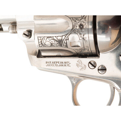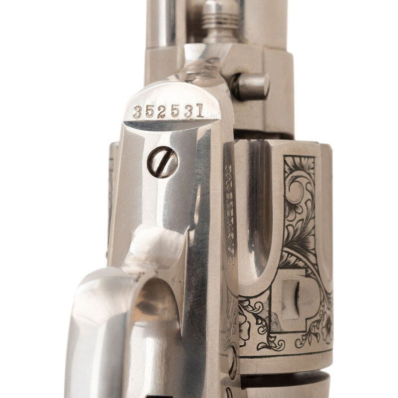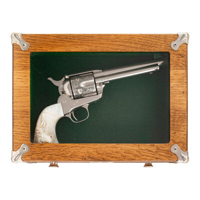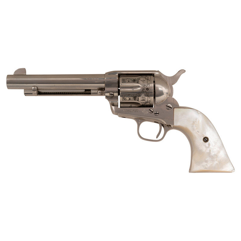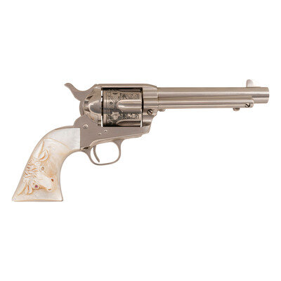 .45 Colt. 5.5 barrel. SN: 352531. Nickel finish, raised carved mother of pearl steer's head grips. Single action smokeless frame revolver with loading gated, fluted six-chambered cylinder, frame notch rear sight and blade front sight. One line barrel address reads: COLT'S PT. F.A. MFG. Co. HARTFORD, CT. U.S.A. Lower left of frame with "three date in two line" patent marking and Rampant Colt logo. Front left of triggerguard web with Colt proof in triangle and the number 1. Matching serial numbers on bottom of frame and on backstrap and grip strap, under the grips. Rear face of cylinder marked with the last two numbers of the serial number, "31". Cylinder with 20th century engraving in flowing foliated motifs. Revolver is housed in a lockable glass topped wooden display box. A lovely pre-war Single Action with attractive grips and in very nice condition. {C&R}