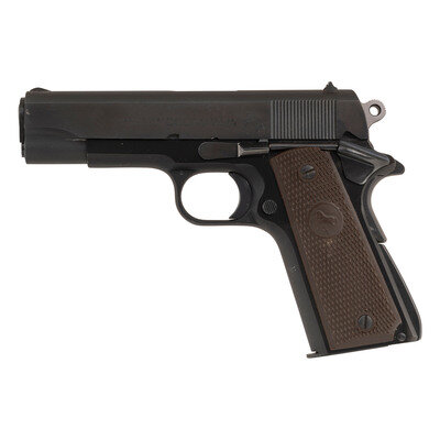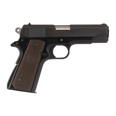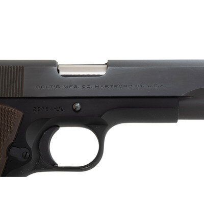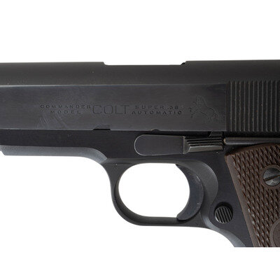 .38 Super. 4.25" barrel. SN: 29764-LW. Blued metal finish with black anodized frame showing polished flats and matte rounds and displaying a polished chamber and muzzle, and polished hammer flanks mounting Colt logo brown Coltwood grips. Short-recoil operated single action autoloading pistol fed by detachable single stack magazines. Sights consist of military style rear notch and matted front blade. Left slide marked COMMANDER/MODEL COLT SUPER .38/AUTOMATIC followed by {Rampant Colt} logo. Right slide marked in a single line COLT'S MFG. CO. HARTFORD CT. U.S.A. Frame struck with Colt's VP monogram proof marking. Barrel marked COLT SUPER .38 AUTO. Item comes in a brown cardboard COLT marked box with the base marked with a matching serial number in grease pen. {C&R}