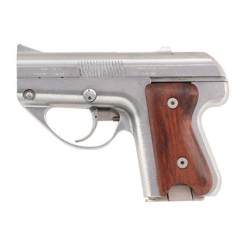 Designed by Philip R. Lichtmann and patented in 1977, the Semmerling LM-4 pistol was offered for sale beginning in 1979 as a large caliber backup gun for the discerning buyer. Despite its outward appearance, the handgun is manually cycled either by grasping the slide with the supporting hand or by flicking the weapon aggressively in the event the user must rely on only one hand. Though unorthodox, this method of operation permitted the handgun to be produced in an extraordinarily compact size for its caliber. From the top of the rear sight to the base of the magazine floorplate, the pistol measures 3.75 inches. At approximately 5.25" in length, the handgun offered a .45 ACP weapon in a package small enough for ankle carry.
