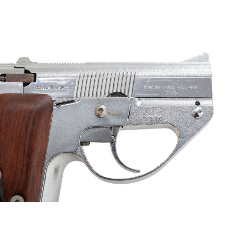 .45 ACP. 3.5" barrel length. SN: 339. Nickel plated finish overall mounting smooth walnut grip panels and matted front ramp and low-profile rear notch sights. Detachable magazine fed manually cycled repeating pistol with manually engaged lock to right frame and DAO trigger. Maker marks to left slide read MOD. LM-4/PATENTS PENDING forward of cocking serrations and SEMMERLING CORP./BOSTON, MASS. behind serrations. Right slide marked CAL.45 ACP over chamber and STD. MIL. SPEC. CTG. ONLY over serial number to right muzzle.