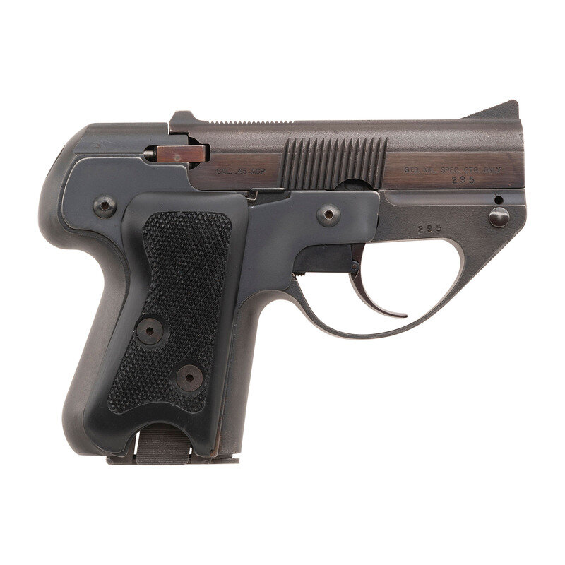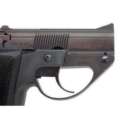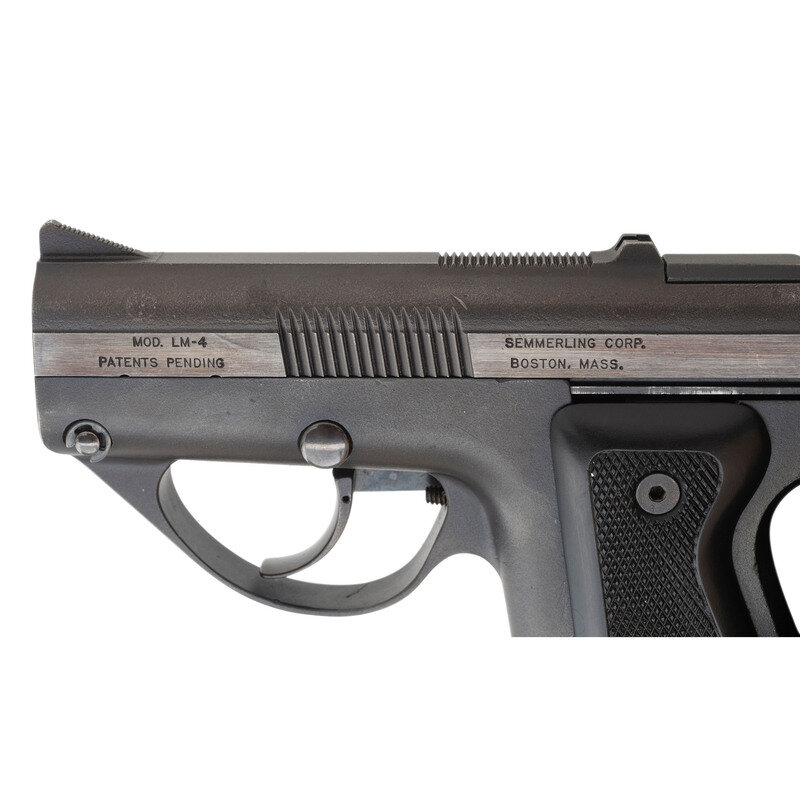 .45 ACP. 2.45" barrel length. SN: 295. Blued metal finish with polished blued barrel flanks and matte remaining finish mounting checkered black synthetic grips. Detachable magazine fed manually cycled repeating pistol with manually engaged lock to right frame and DAO trigger. Maker marks to left slide read MOD. LM-4/PATENTS PENDING forward of cocking serrations and SEMMERLING CORP./BOSTON, MASS. behind serrations. Right slide marked CAL.45 ACP over chamber and STD. MIL. SPEC. CTG. ONLY over serial number to right muzzle.