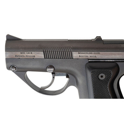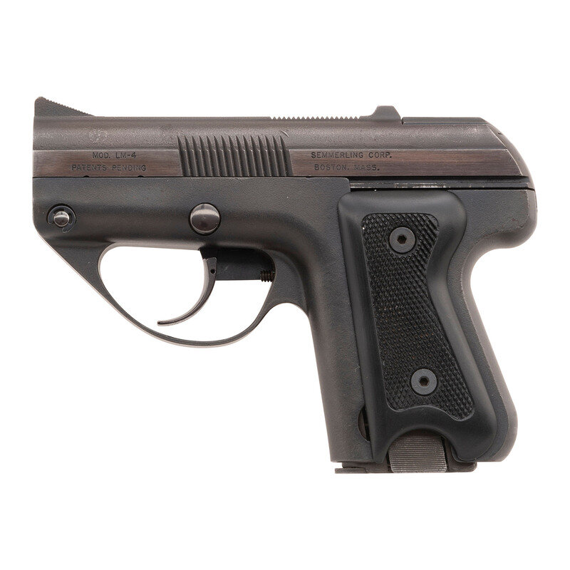 Designed by Philip R. Lichtmann and patented in 1977, the Semmerling LM-4 pistol was offered for sale beginning in 1979 as a large caliber backup gun for the discerning buyer. Despite its outward appearance, the handgun is manually cycled either by grasping the slide with the supporting hand or by flicking the weapon aggressively in the event the user must rely on only one hand. Though unorthodox, this method of operation permitted the handgun to be produced in an extraordinarily compact size for its caliber. From the top of the rear sight to the base of the magazine floorplate, the pistol measures 3.75 inches. At approximately 5.25" in length, the handgun offered a .45 ACP weapon in a package small enough for ankle carry.