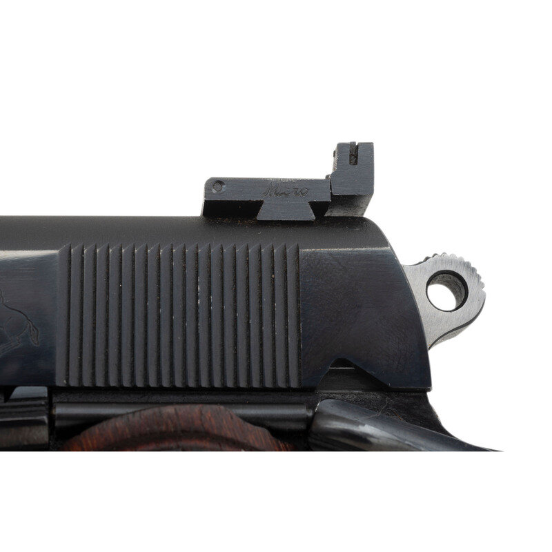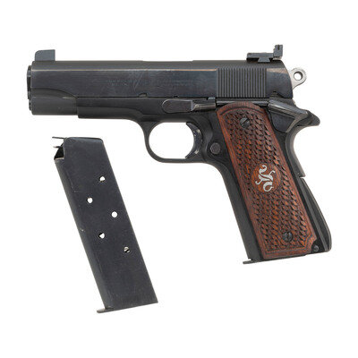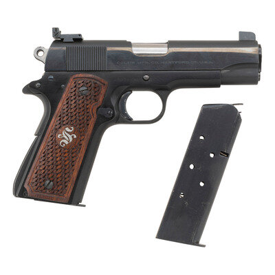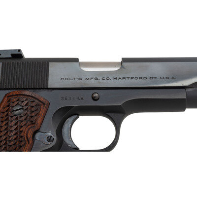 .45 ACP. 4.25" barrel. SN: 3634-LW (mfg. ca. 1950). Blued finish, checkered wood grips. Single action Browning design short recoil tilting barrel magazine fed semi-automatic pistol with aluminum frame. Standard Colt markings. "Micro" marked adjustable rear sight with tall serrated rear front sight blade. Grips are aftermarket replacements. Includes a total of two blued Colt marked 7-round magazines. {C&R}
