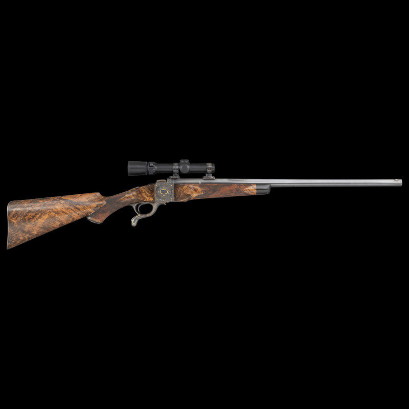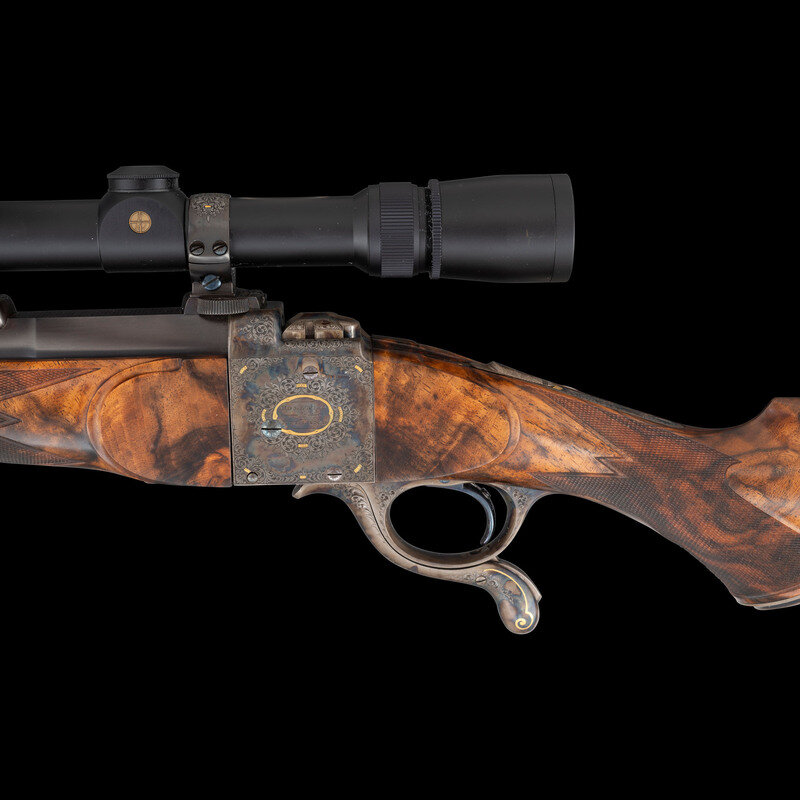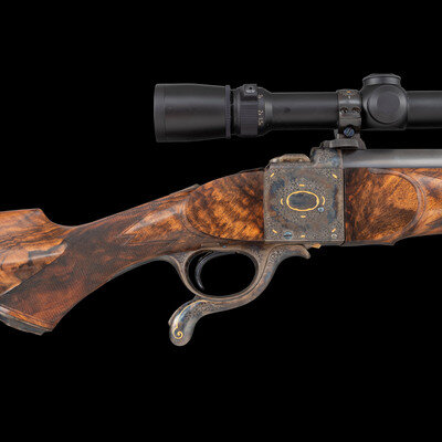 Stephen R. Heilmann began his gunmaking career in 1970, as a student at the Colorado School of Trades. In 1973, he opened his first business called simply The Gunworks, in Grass Valley, California. He quickly established his excellence in the field, so much so, that by 1980 it became necessary to establish a larger business to keep up with demand. In 1985, he joined the American Custom Gunmakers Guild, and continued to repair, rebuild, and produce custom guns until his passing on September 15, 2024. This rifle displays some of the very finest qualities of his work by superbly blending the replacement barrel with the original action and matching the style both of English originals, the exquisite details of Hensley's work, and the bold gold embellishments added by Wallace.