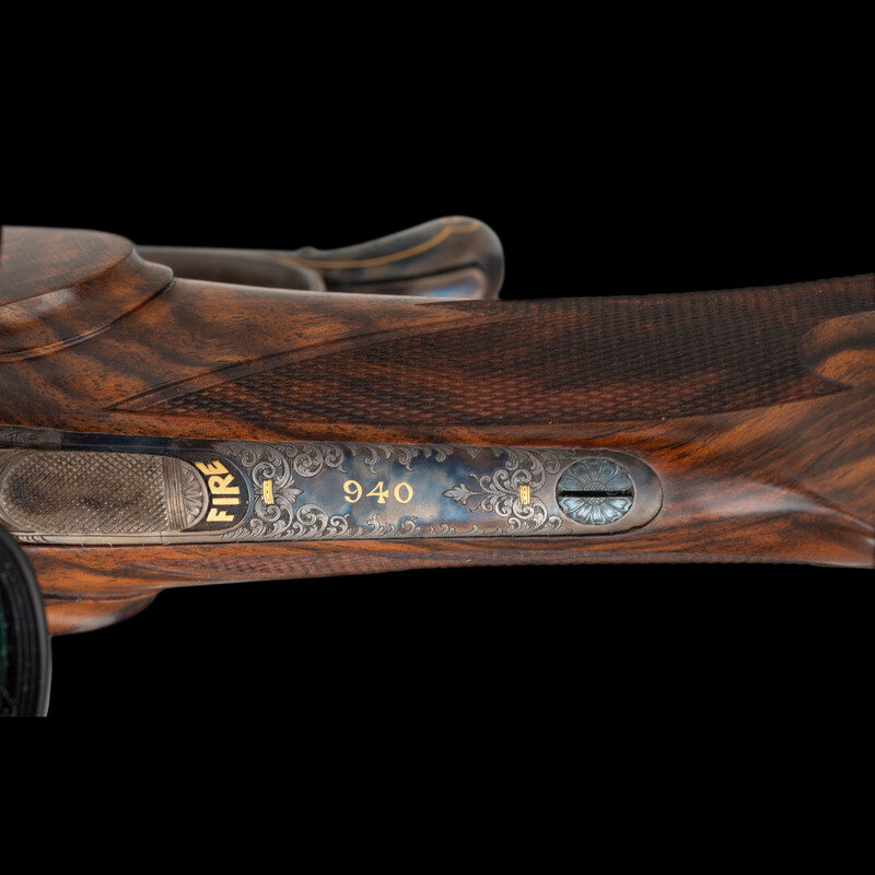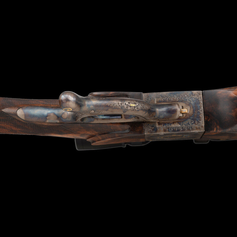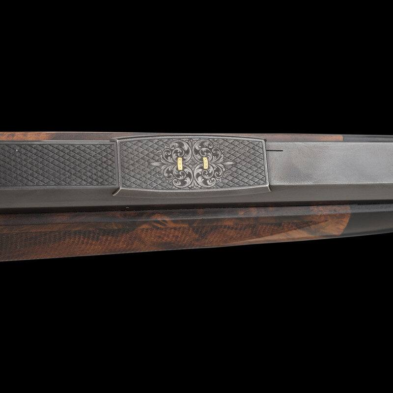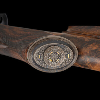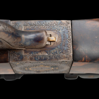 Terril Lee Wallace, far better known as Terry, was a master engraver, a charter member of the American Custom Gunmakers Guild, and a charter member of the Firearm Engravers Guild of America. A keen hunter and outdoorsman, Wallace was certainly comfortable wielding firearms as well as embellishing them. In the case of this lot, the gold highlights occasionally appear on period originals, but the bold style produces an appearance that is thoroughly modern and yet disarmingly traditional. Elaborate gold borders ensure there can be no mistaking the rifle's English pedigree with the precisely executed engraving paying homage to one of the most coveted names in firearms history.