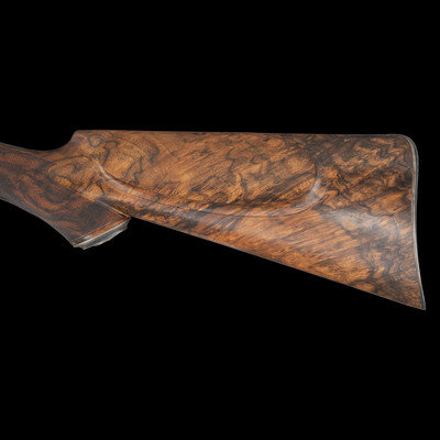 Darwin Hensley's work, both as a stockmaker and gunmaker, commands deep respect in the gunmaking community. He was a member of the American Custom Gunmakers Guild, and founded Hensley and Hensley, which still persists after his retirement. While there were other competing stockmakers willing to use elaborately figured walnut, and who eagerly displayed their skills by working sumptuous carved designs into their work, Hensley's stocks bear a subtle grace exemplified in this lot. Cleanly executed borders and checkering highlight beautifully polished walnut with a vibrant natural grain. {MODERN}