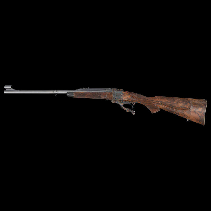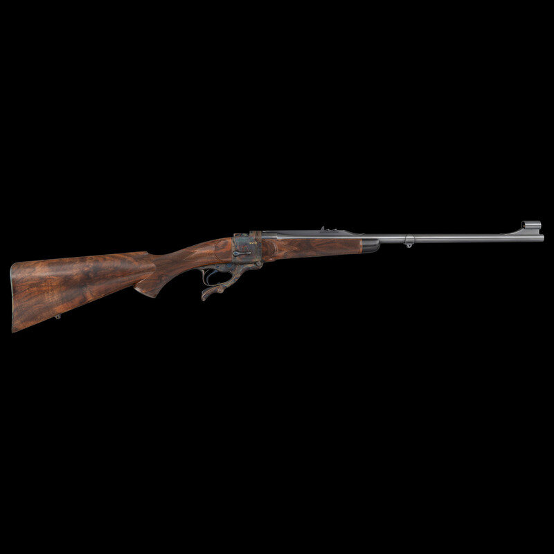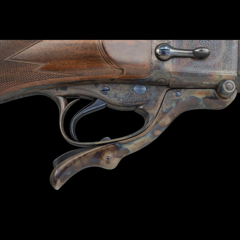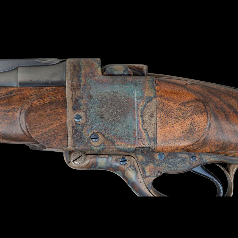7x57mmR. 22" barrel length. SN: 17274. Blued finish to barrel and small parts with the frame components case colored mounting a walnut semi pistol grip stock with fine multipoint checkering to the wrist and forend. Single shot falling block Farquharson action rifle featuring a fully hooded front bead sight on a matted ramp paired with three position folding rear notch with gold lines set in a matted barrel rib. Semi pistol grip cap and buttplate are skeletonized and enclose checkered ebony inserts beautifully inlet along the edges. Stock additionally mounts a cheek pad to left comb. Original markings include the GEORGE GIBBS/BRISTOL banner to the left frame, and British firing proofs to the rear of the breechblock and the left frame near breech. Left barrel displays an engraved caliber mark reading 7 X 57 R. Barrel further marked below the handguard S.R.H. 93, indicating it was restored by renowned gunsmith Stephen Heilmann. The lack of British firing proofs indicate the barrel was replaced, and the combination of integral quarter rib, barrel band, and front sight ramp are typical of Heilmann's work. Frame, buttplate, and semi pistol grip caps feature best quality English rose and scroll engraving including wheat chaff engraving on the edges enclosing spiral scroll engraving enclosing floral bouquets. Screw heads display sunburst engraving. Stock displays the "Double Ogee" technique favored by stockmaker Darwin Hensley, who repeatedly collaborated with Heilmann on other rifles in this collection. The superb inletting of the stock, coupled with the scalloped borders surrounding the checkering and details, are all classic indicators of Hensley's work. Though built on an original George Gibbs frame, possibly from a target rifle given its lack of a stalking safety, this rifle constitutes nothing less than a fully realized custom rifle created by two of the most respected modern gunmakers.