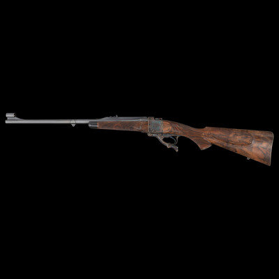 Darwin Hensley's work, both as a stockmaker and gunmaker, commands deep respect in the gunmaking community. He was a member of the American Custom Gunmakers Guild, and founded Hensley and Hensley, which still persists after his retirement. While there were other competing stockmakers willing to use elaborately figured walnut, and who eagerly displayed their skills by working sumptuous carved designs into their work, Hensley's stocks bear a subtle grace exemplified in this lot. The clean scalloped borders without overruns, precise inletting, and the organic sweeping curves of the counterpanes make for elegant work that only grows more impressive with further viewing. Though the forend has not been removed to verify Hensley's mark, the rifle bears the classic indicators of his work, and other custom rifles ordered by Jeffrey Sanner were stocked by Hensley. {MODERN}