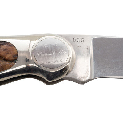 3" blade length. 8.25" overall with hilt. Straight single edge drop point blade with nickel plated bolsters, horn grip scales, and a lanyard loop to the pommel. The right side of the button lock is hand engraved U. S./Patent No/4148140, and the right ricasso is struck 035, making this an early example of James Lile's folding knives. Bolsters are retained with two pins along the backstrap. Interior of the backstrap struck with date marking 83, indicating it was made in 1983.