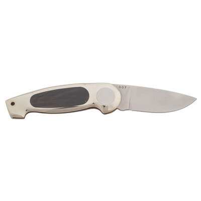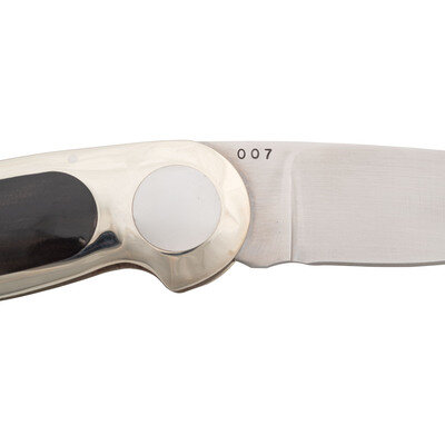 2.25" blade length. 6.25" overall with hilt. Straight single edge drop point button lock folding knife with nickel plated bolsters retained by two pins along the backstrap, and polished horn grip scales. Left blade is struck LILE with no dot, while the right is marked 007, indicating it was made during James B. Lile's lifetime and was number 7 in the series. The bolsters are retained by two crosspins along the backstrap, and the interior backstrap is marked 1987 U.S. Pat# 4148140.