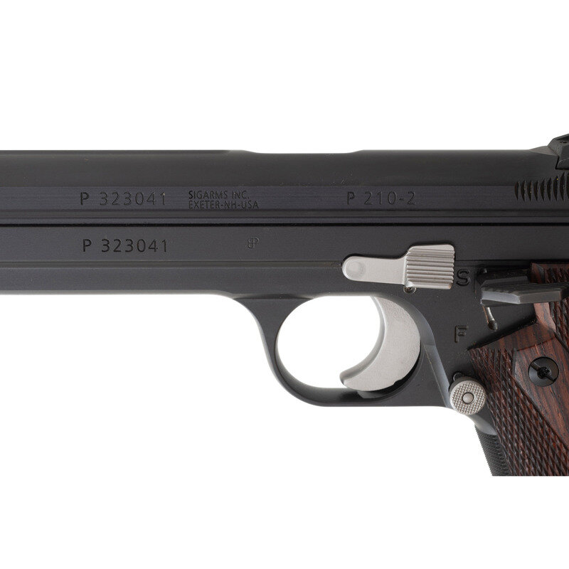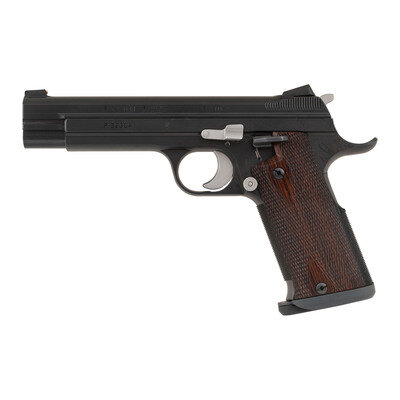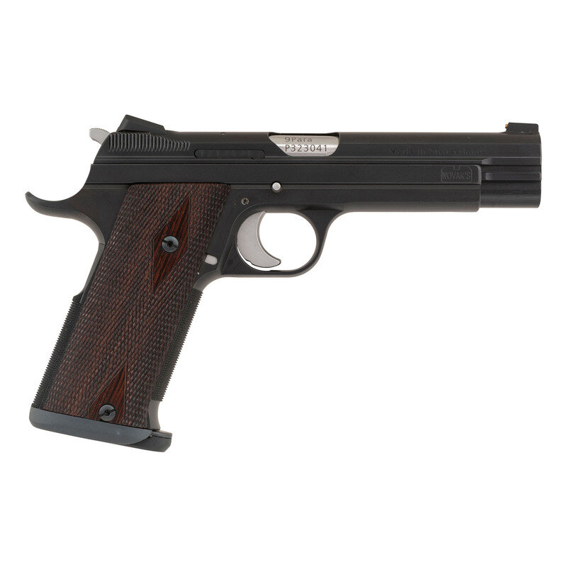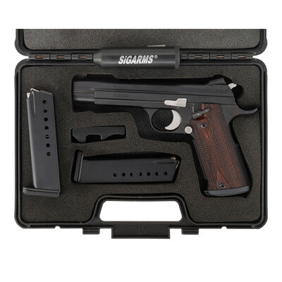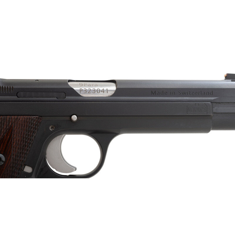 9mm Para. 4.7" barrel length. SN: P323041. Black Nitride Novak finish overall with polished barrel mounting Spegel diamond checkered Cocobolo grips and matte small parts. Short recoil operated single action autoloading pistol fed by detachable single stack magazines customized by Novak's Inc. Right frame struck with NOVAK'S logo. Standard make and model markings elsewhere include SIGARMS INC./EXETER-NH-USA to left slide BP proof to left frame, and Made in Switzerland to right slide. Item comes in a matching Sig marked black synthetic hard case with work order. Custom modifications include: extended beavertail, recontoured backstrap, flared magazine well extension, checkered forward gripstrap, checkered backstrap, extended Novak's magazine release, extended Novak's safety lever, Novak's sights including gold bead front blade and black rear, Spegel grips, Novak's gripscrews, and a refinish. Included in the case are two spare magazines with base pads, owner's manual, factory test target, Sig marked magazine loading tool, and a self-contained SIGARMS cleaning kit with two piece cleaning rod, bore brush, bore mop, and patch loop. {MODERN}