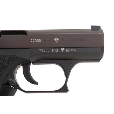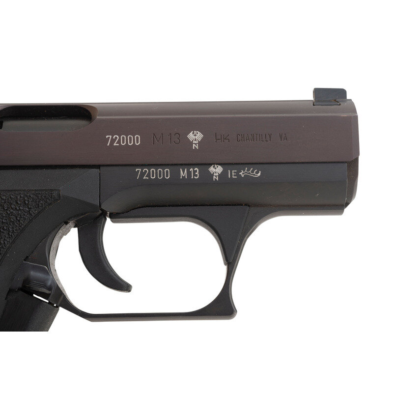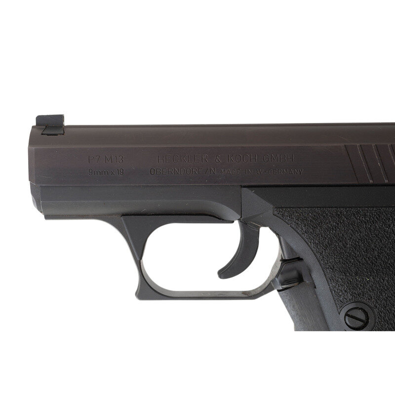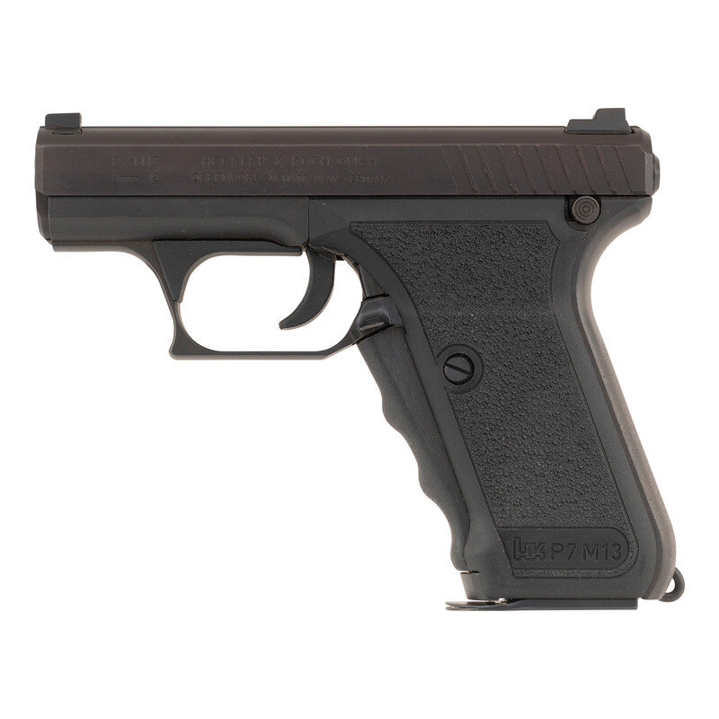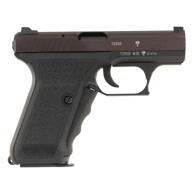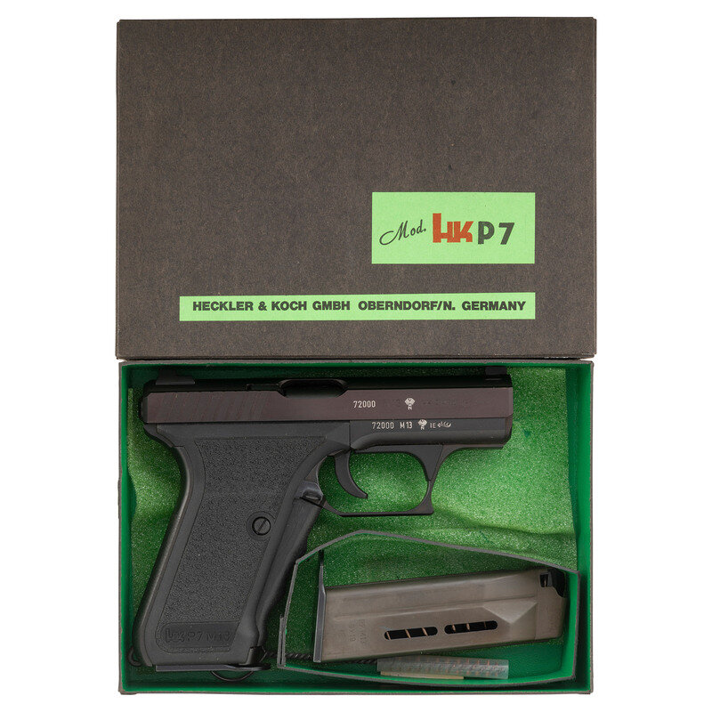 9mm Para. 4.1" barrel length. SN: 72000. Blued metal finish with blued chamber and polished barrel mounting stippled black synthetic grips marked HK P7 M13. Gas delayed blowback operated squeeze cocking autoloading pistol fed by detachable double stack magazines. Left slide struck with model and caliber mark P7 M13/9mmx19 followed by HECKLER & KOCH GMBH/OBERNDORF/N MADE IN W-GERMANY. Right slide marked M13 followed by HK CHANTILLY VA. Item shows standard commercial firing proof markings including a date code of IE, indicating it was proofed in 1984. Comes in matching cardboard Heckler & Koch marked box with one spare magazine, chamber brush, owner's manual, warranty card, and factory test target. {MODERN}