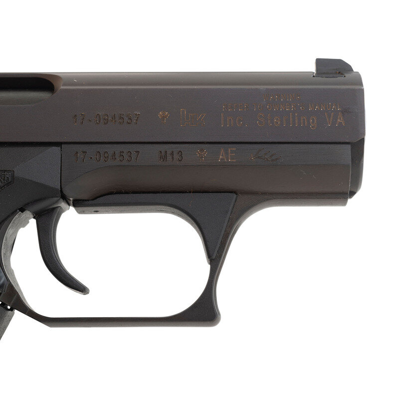 9mm Para. 4.1" barrel length. SN: 17-094537. Blued metal finish with polished barrel mounting stippled black synthetic grips showing HK P7 M13 markings. Gas delayed blowback operated squeeze cocking autoloading pistol fed by double stack magazines. Left slide legend reads HECKLER & KOCH GMBH/OBERNDORF/N MADE IN GERMANY followed by 9mmx19 caliber marking. Right slide marked WARNING/REFER TO OWNER'S MANUAL over HK Inc. Sterling VA. Commercial firing proofs to all major parts including AE date code to right frame indicating it was proofed in 2004. Item comes in a matching black synthetic case with owner's manual, warranty card, factory test casing, chamber brush, and spare magazine. {MODERN}