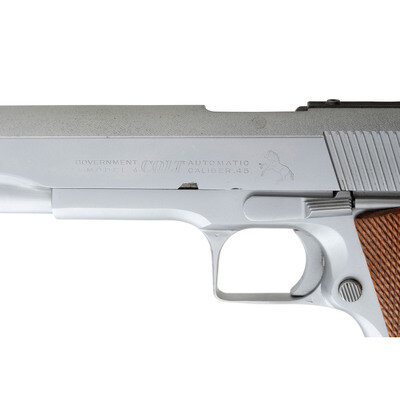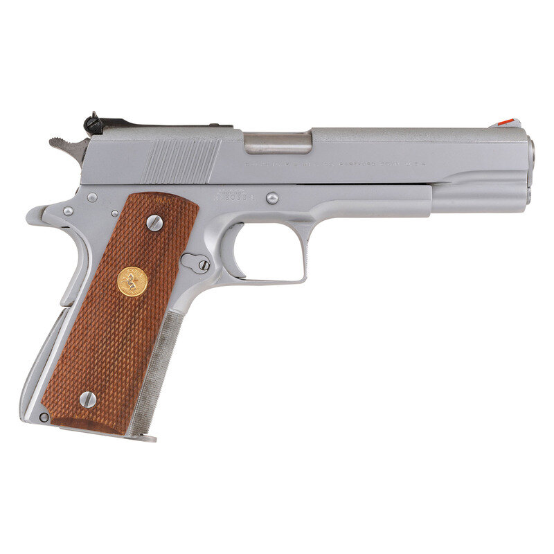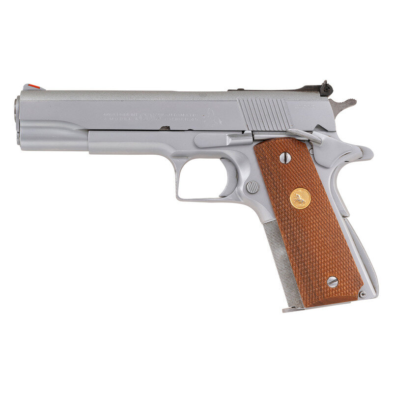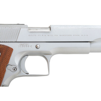 .45 ACP. 5" barrel length. SN: 319058-C. Hard Chrome plated finish overall mounting checkered COLT medallion walnut grips with Smith & Wesson pattern matted front ramp sight with red plastic insert, and white outline adjustable rear notch. Short-recoil operated single action autoloading pistol fed by detachable magazines and built by Armand Swenson. The left slide and right frame are both struck A.D. SWENSON/GARDENA. CALIF., indicating this handgun was built by Armand Swenson. Original colt marks include GOVERNMENT/MODEL COLT AUTOMATIC/CALIBER .45 followed by {Rampant Colt} to left slide, and COLT'S PT. F.A. MFG. CO. HARTFORD. CONN. U.S.A. to the right. Upper slide is custom matted with engraved outline in the style common to Swenson 1911s. Further hallmarks include the squared off triggerguard with checkered forward edge, custom checkering to the forward gripstrap, extended slide stop, matted rear slide, and a beveled magazine well. {MODERN}