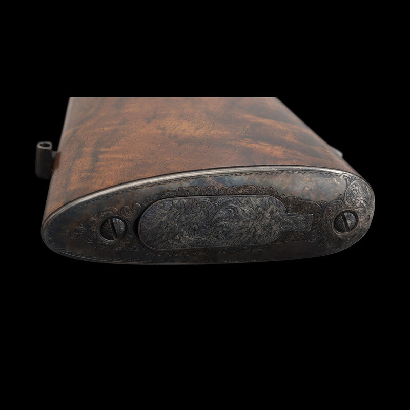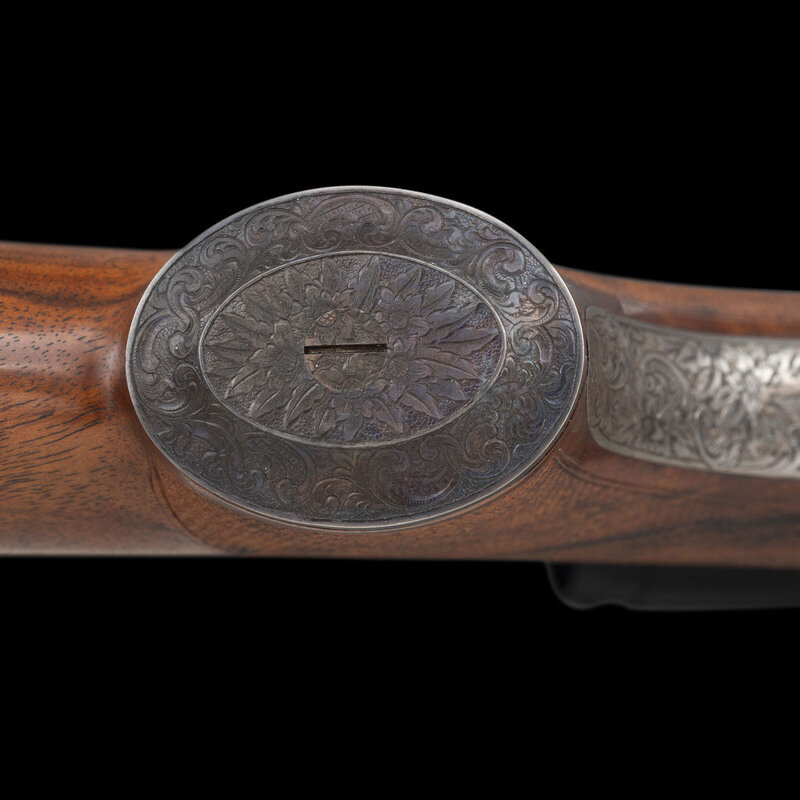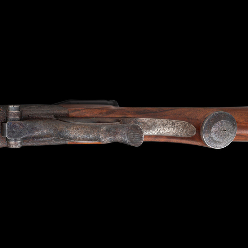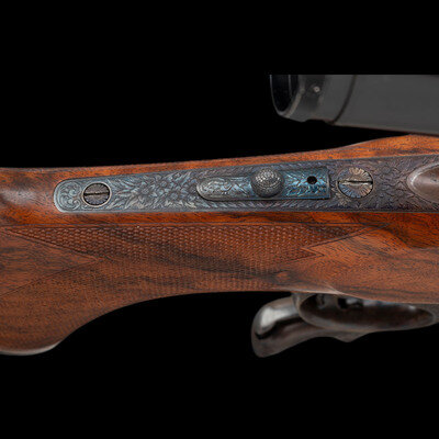 A fine collaborative work produced by two of America's most respected craftsmen. In particular, it is notable for serving as an ideal canvas for engraver Alvin A. White to indulge in a bold German and Austrian influenced style, a fine contrast to the more minute engraving necessary on a more compact arm, such as the revolvers he is most famous for engraving. Through the course of his sixty year career, White achieved recognition as both a Master engraver, and as the mentor to the next generation of fine American firearms engravers, including Andrew Bourbon, and Daniel Cullity.