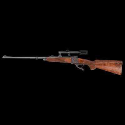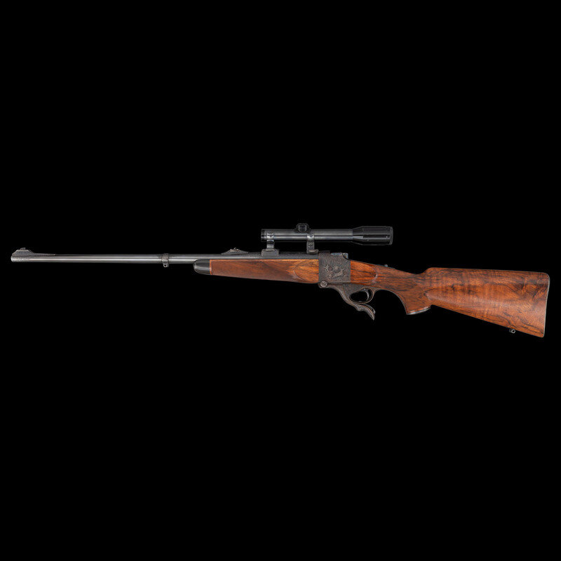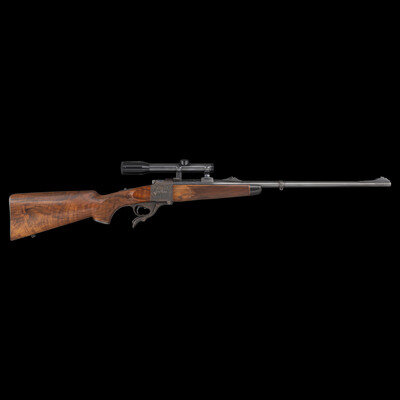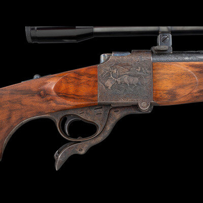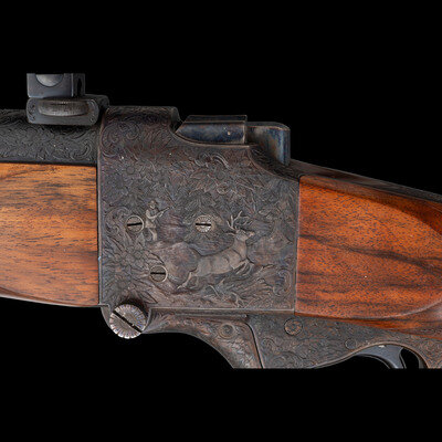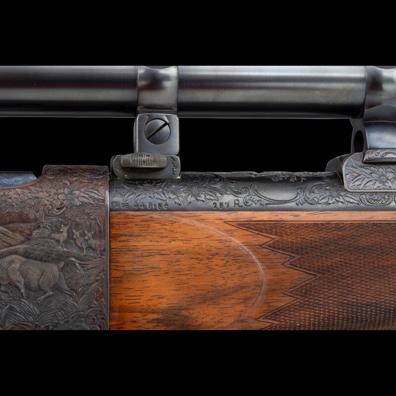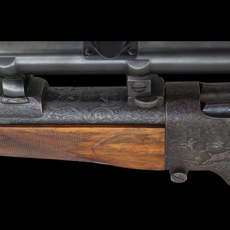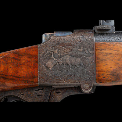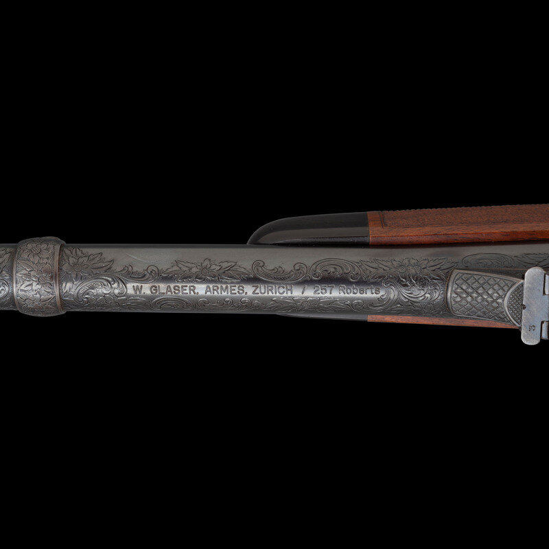 .257 Roberts. 26.25" barrel length. SN: 450. Blued finish to barrel with the remaining components exhibiting a casehardened finish set in a walnut semi-pistol grip stock with fine bordered multipoint checkering to the wrist and forend. Single shot falling block Farquharson action rifle richly engraved with Continental style deep relief engraving. Barrel address and caliber marking forward of the rear sight reads W. GLASER, ARMES, ZURICH / 257 Roberts, indicating it was made at the firm of Walter Glaser in Zurich. Founded in 1906, the company produced and repaired a wide variety of arms including autoloading pistols, military service arms, and sporting arms such as this lot. Left barrel is engraved below handguard A.A. WHITE-ENG, for the famous Colt Master Engraver Alvin A. White, whose work adorns some of the most beautiful and coveted arms ever struck COLT'S. Right barrel struck with German firing proofs and 257 R. caliber marking. Sights consist of a front brass bead on a matted island, and a rear folding notch island sight with three settings for 100, 200, and 300 meters. A German claw mount scope base is installed on the rifle, and features engraving matching the rest of the rifle. Scope rings are not engraved, and the currently mounted optic is a HENSOLDT/WEITZLAR/DIASTA/2 3/4 X 21 telescopic sight.