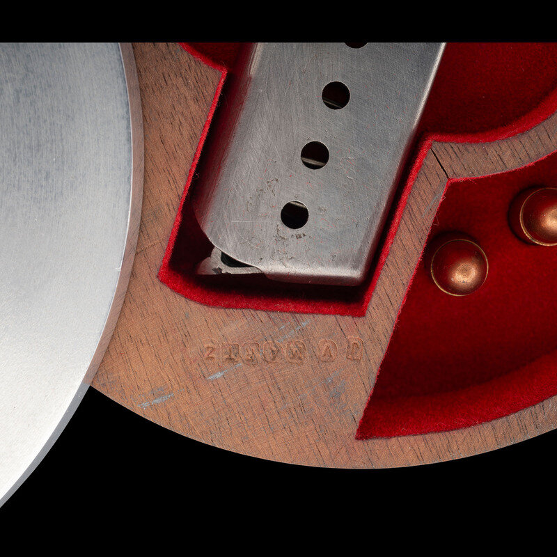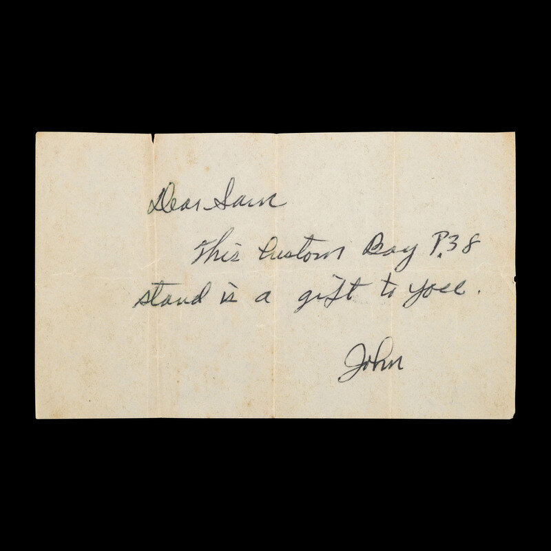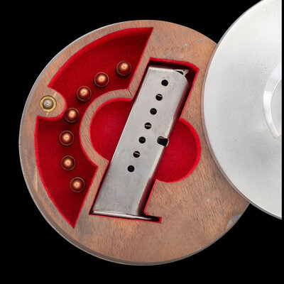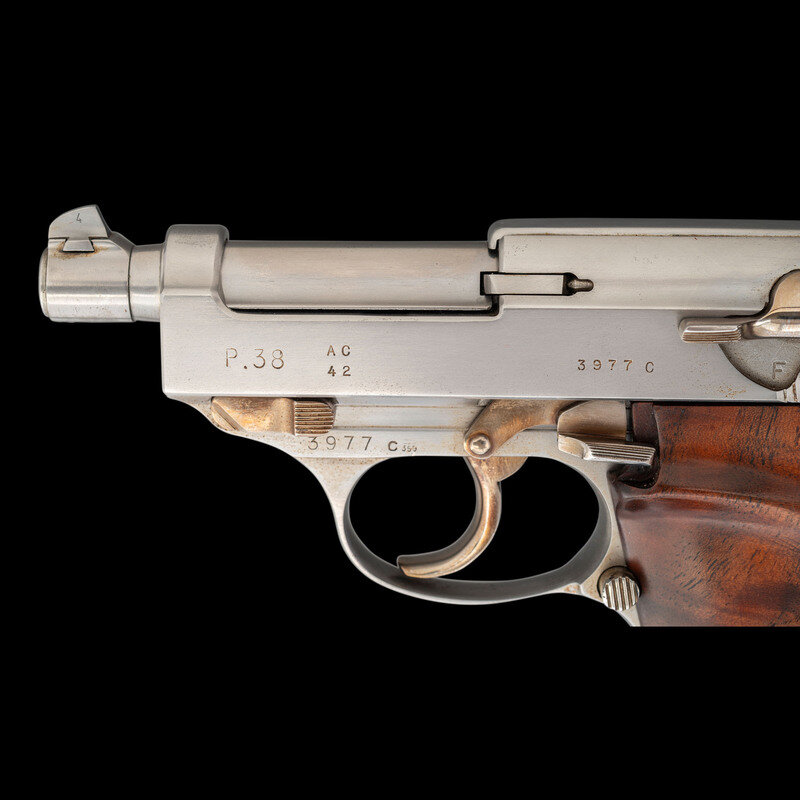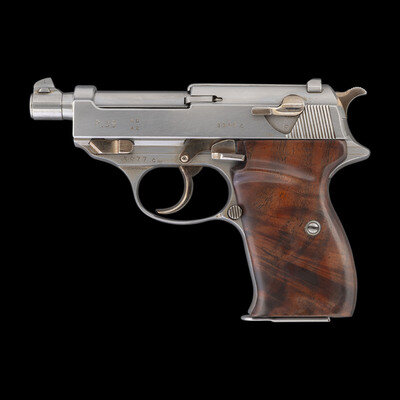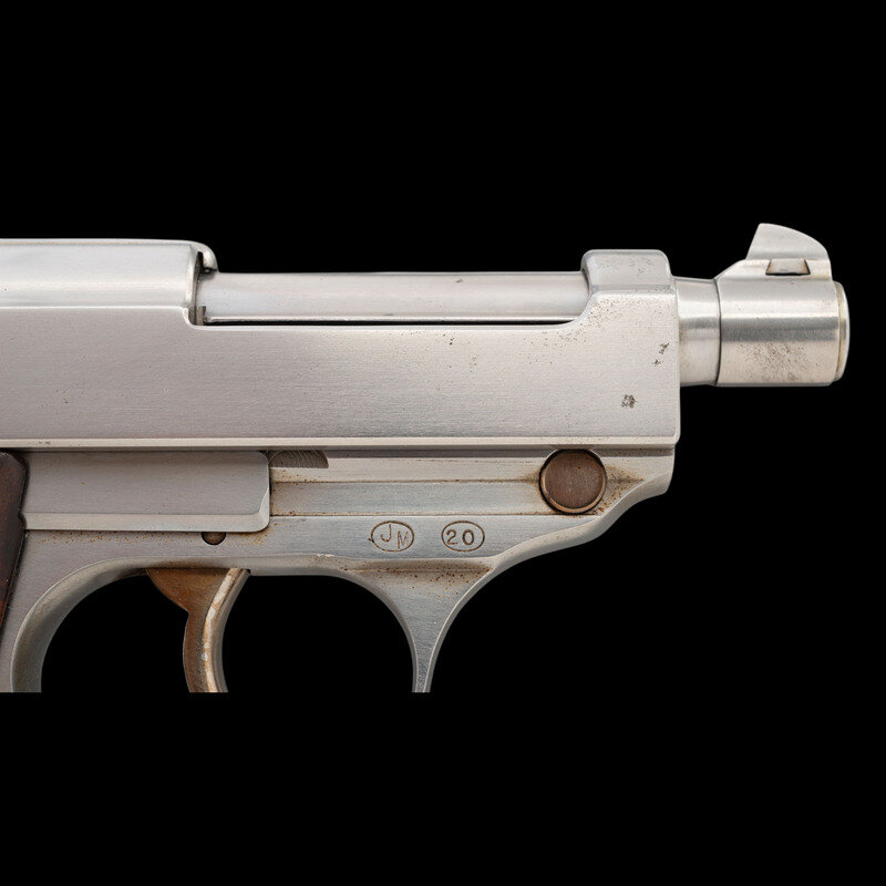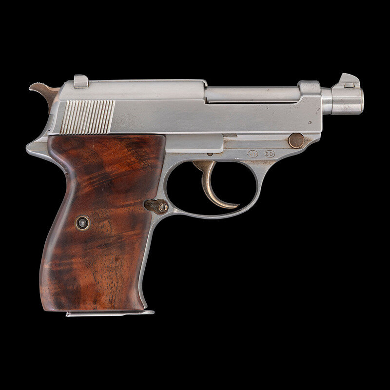 9mm Para. 3.25" barrel length. SN: 3977c. Polished bright finish with straw colored small parts mounting smooth walnut custom two-piece grips. Short-recoil operated DA/SA autoloading custom made pistol fed by detachable single stack magazines. Item has been extensively modified from its original configuration by gunsmith John V. Martz. Sights consist of dehorned military pattern rear notch and front blade sights with relocated muzzle ring. Both the barrel and frame have been shortened from stock configuration. Additionally, the original heel magazine release has been omitted with a button release installed below and behind the trigger. Magazine has been shortened and cut to interface with the new magazine latch. The follower and spring have likewise been modified from their original forms. Original serial numbers are mixed, typical of guns selected by John V. Martz for modification. Marks to the slide restruck P.38 followed by AC/42, indicating the donor slide was manufactured by Walther in 1942. Left frame, barrel, and locking link show weakened {Eagle/359} waffenamt markings. Right frame struck with the circled JM signature of John Martz followed by a circled 20. Item comes with a custom made wood and aluminum display stand with rotating lid concealing storage for one magazine and seven rounds of dummy ammunition. The maker marking J V MARTZ is struck into the wood below the lid. Item comes with only one custom shortened magazine. It is finished bright, and shows a cut off P.38 mark. A handwritten note below the magazine reads, "Dear Sam, This Custom Bay P.38 stand is a gift to you. John."