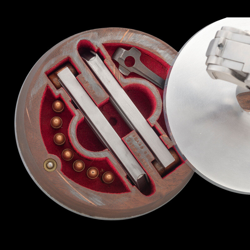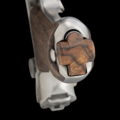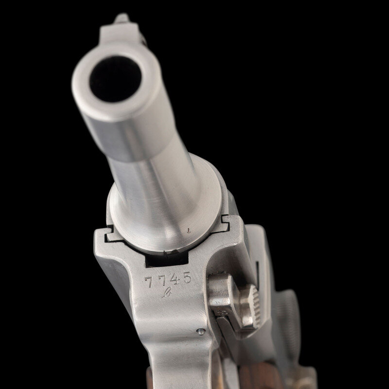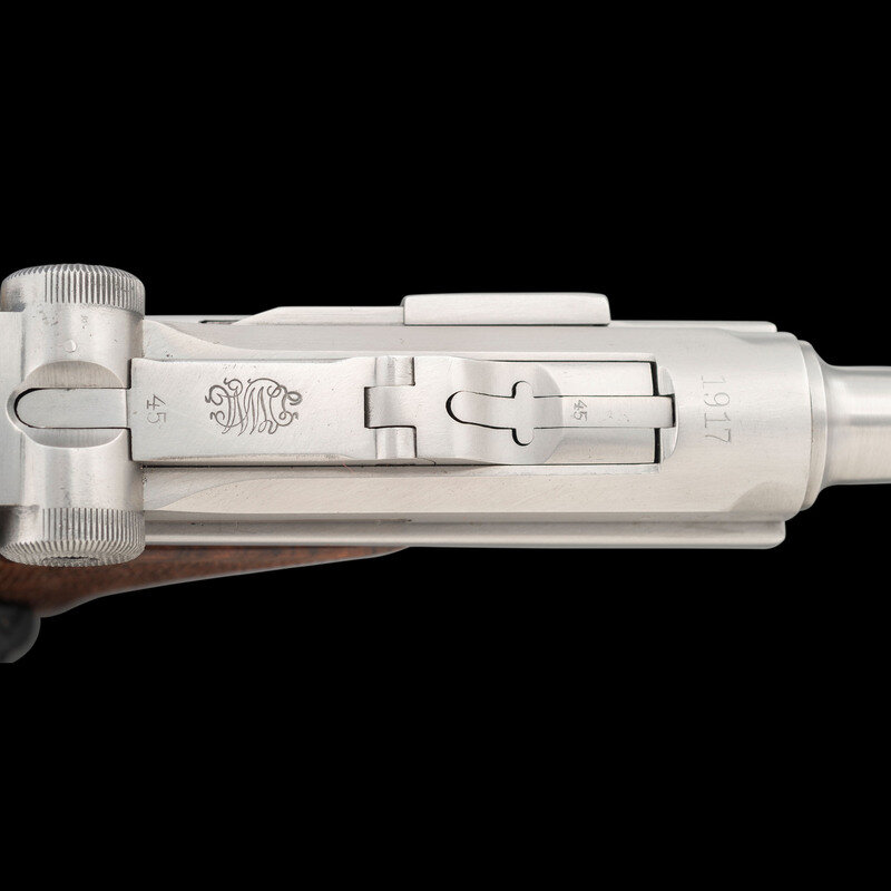 9mm Para. 2.625" barrel length. SN: 7745b. Polished bright metal finish overall with straw colored small parts mounting bordered checkered walnut grips. Short recoil operated striker action toggle locked autoloading custom pistol fed by detachable single stack magazines. Left frame is struck with the circled JVM marking of gunsmith John V. Martz, followed by number 206. Toggle link is struck with the DWM marking and the barrel extension is dated 1917. The breechblock and barrel extension show Imperial German inspection marks and proofs, indicating the donor gun was a World War I German military Luger pistol. Pistol has been heavily customized with a shortened barrel, rebalanced action, and a shortened frame. Item comes with a custom stand composed of walnut and aluminum. The aluminum faux magazine supporting the pistol is struck JVM on the upper edge. The wood is additionally struck 3-17-82, indicating the stand was built in 1982, along with STAND BY/JOHN V. MARTZ. Included in the stand are two matching custom shortened polished bright magazines with wood base plugs showing JVM stamp and each numbered 1 and 2. Additionally included are seven dummy rounds of ammunition, and a Luger disassembly tool.