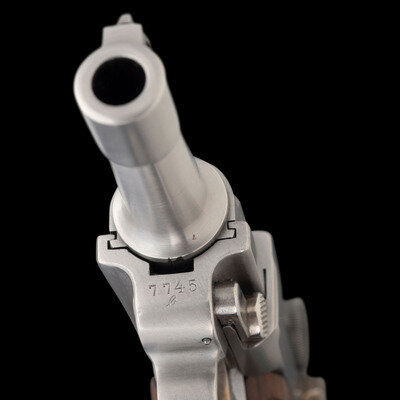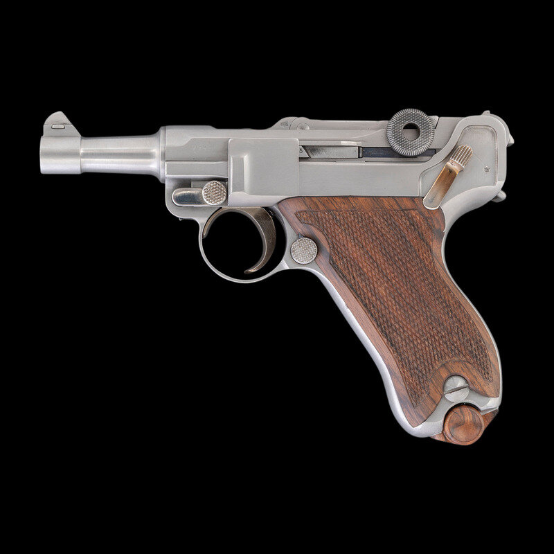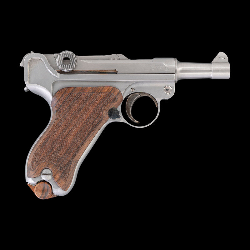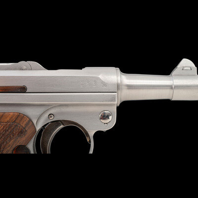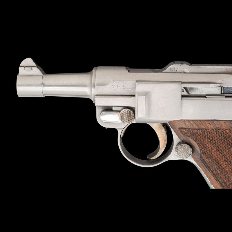 John V. Martz began working as a self-taught gunsmith in 1968, initially using his metalworking skills to repair Luger pistols and fit them with newly fabricated spare parts as the wartime bringbacks began to show over two decades of wear and tear. By 1977, Martz had committed himself as a full time gunsmith. In the years that followed, he established an esteemed reputation for restoring badly damaged handguns to good working order, and for producing unique custom varieties of both Luger pistols and P.38 pistols. This lot represents one of his "Baby" Luger 9mm caliber pistols, a compact conversion of the original Luger pistol inspired by the prototypes supervised by Georg Luger himself. Martz died on July 15, 2013, having endeared himself to the shooting and collecting communities with his restorations, unique creations, and his eclectic sense of humor. {MODERN}