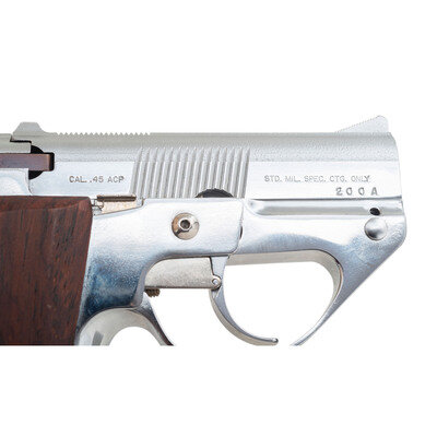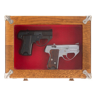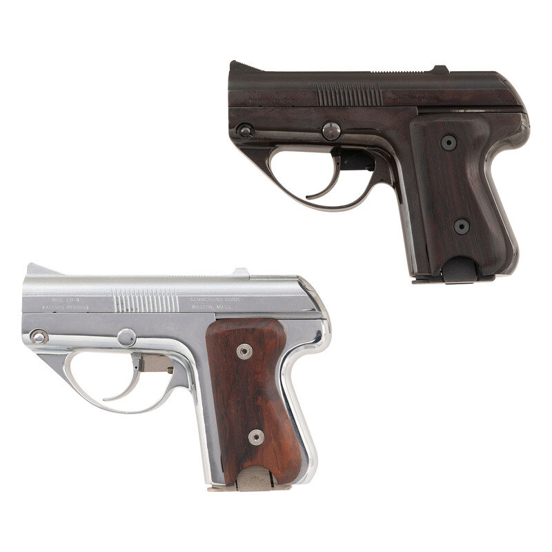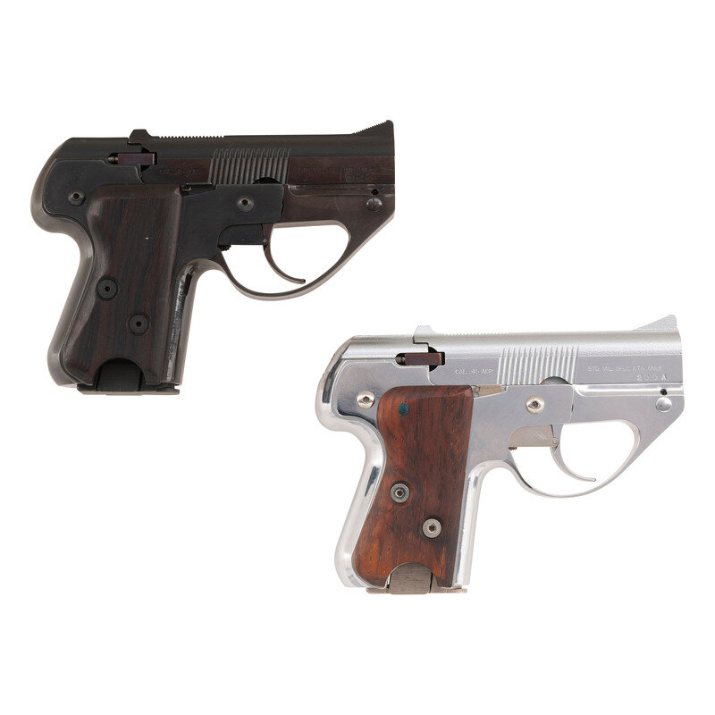 .45 ACP. 3.45" barrel lengths. SN: 200 and 200A. Rare nickel plated and blued pair of Semmerling LM-4 pistols with both mounting smooth walnut grip panels and standard matted front ramp and fixed rear notch sights. Manually cycled pistols featuring DAO triggers and fed by detachable single stack magazines. Both pistols display standard make and model markings including MOD. LM-4/PATENTS PENDING and SEMMERLING CORP./BOSTON, MASS. to the left slide and CAL. .45 ACP followed by ST. MIL. SPEC. CTG. ONLY to the right. Blued example shows serial number 200 with the nickel version marked 200A. Each pistol comes with an appropriately matching finish to the magazines. Lot comes in a wood two drawer display case by H. Gerstner & Sons of Dayton, Ohio.