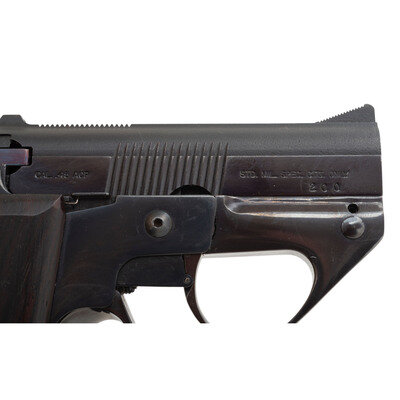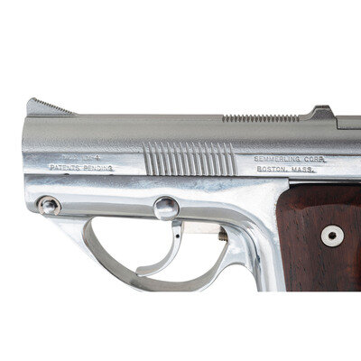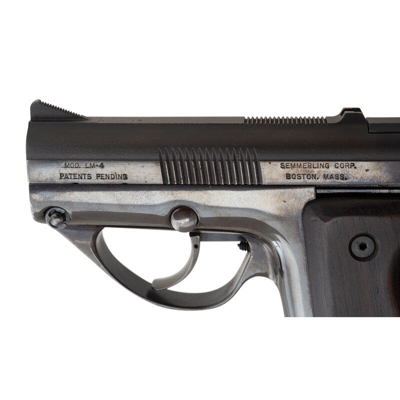 Designed by Philip R. Lichtmann and patented in 1977, the Semmerling LM-4 pistol was offered for sale beginning in 1979 as a large caliber backup gun for the discerning buyer. Despite its outward appearance, the handgun is manually cycled either by grasping the slide with the supporting hand or by flicking the weapon aggressively in the event the user must rely on only one hand. Though unorthodox, this method of operation permitted the handgun to be produced in an extraordinarily compact size for its caliber. From the top of the rear sight to the base of the magazine floorplate, the pistol measures 3.75 inches. At approximately 5.25" in length, the handgun offered a .45 ACP weapon in a package small enough for ankle carry.