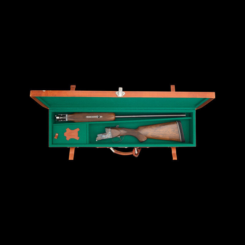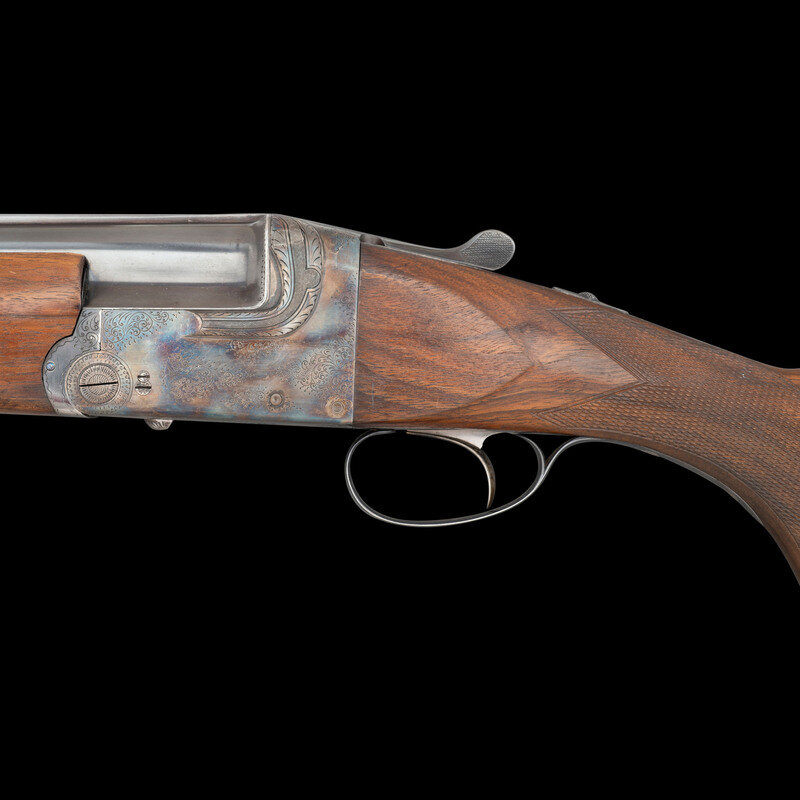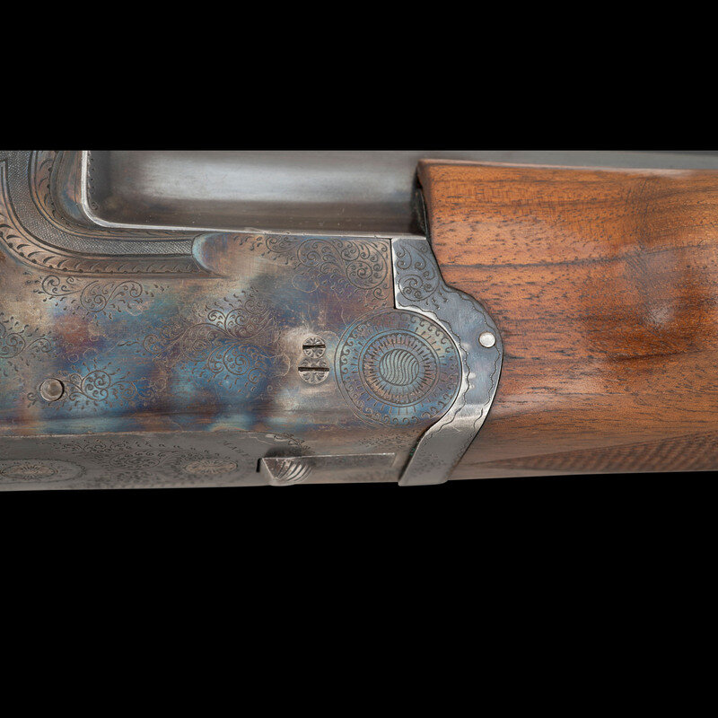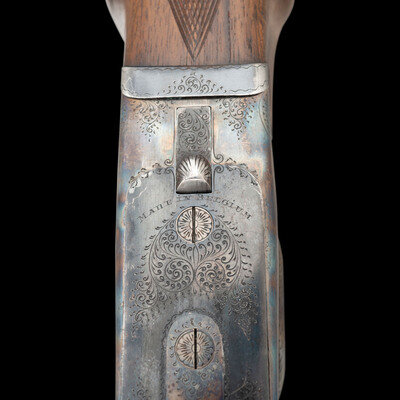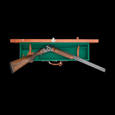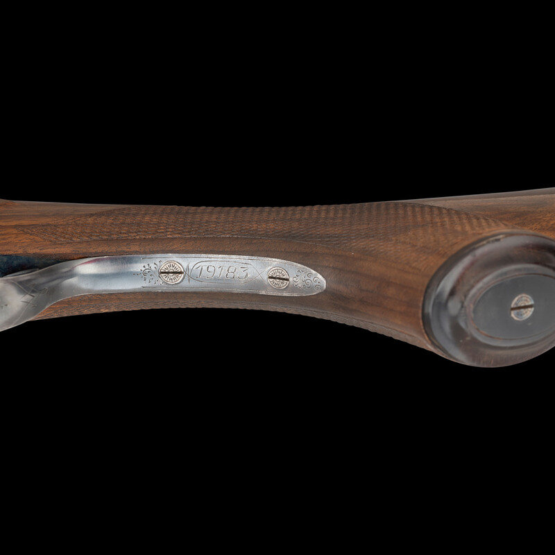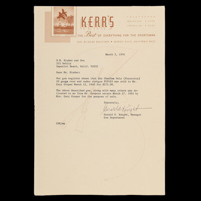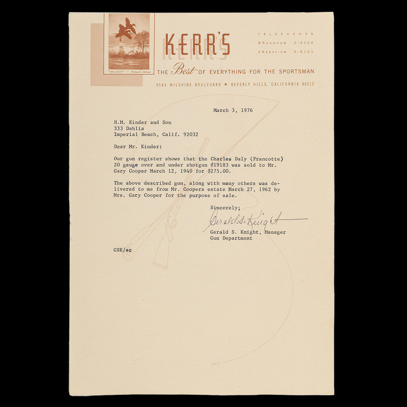 Off the clock, Cooper kept up the outdoor recreational activities he had favored as a youth. And like all avid hunters and trap shooters, Cooper had to find somewhere to buy his equipment. Enter Alex Kerr, founder of "Kerr's Sport Shop", the sporting goods shop of the stars. In 1937, Alex Kerr left the family Mason Jar business to open a sport shop in Hollywood. His store was known for catering to expensive tastes, and kept a supply of high end goods for fishing, hunting, camping, or any other activities his clients might need. In 1940, Kerr's shop sold this Charles Daly marked shotgun to Gary Cooper. It then remained one of Cooper's possessions until his death on May 13, 1961. On March 27, 1962, the firearm was brought back to Kerr's on behalf of Gary Cooper's wife, Veronica Cooper, for future sale. It's possible that the leather case accompanying the shotgun was then paired with it, as it is not of 1940 vintage. Manufactured by Auguste Francotte for the famed Charles Daly and then sold by Kerr's to movie legend Gary Cooper, this shotgun remains in functional condition and bears the signs of both use and careful maintenance.