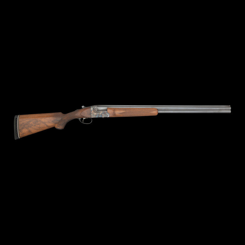 20 Gauge. 28" barrel length. SN: 19183. Modified Choke to top barrel and Cylinder bore to bottom. 2.75" chamber lengths. Blued metal finish with casehardened frame, blued small parts, walnut semi pistol grip stock with horn grip cap, and Pachmayr White Line recoil pad. Double barrel over under boxlock ejector shotgun. Item features a matted barrel rib, white bead front sight mount missing bead but retaining collar, and wood spacers mounted to barrel ribs on both sides. The left side of the upper barrel is marked KERR SPORT SHOP INC./BEVERLY HILLS, CALIF. Beneath that is a second mark reading CHARLES DALY. Both barrels and the frame show Belgian firing proofs with the rear barrels being stamped with a {Crown/AF} marking, and the lower barrel marked ACIER COCKERILL indicating the barrels were made of Cockerill steel. The right side of the frame displays an SG stamp. This embellished shotgun features an unmarked silver oval plate to the toe, and fine floral scrollwork to the frame. The barrel fences feature light border scroll and a stippled border. Included with the shotgun is a green velvet lined leather case with no accessories. Included with the shotgun is a letter signed by Gerald S. Knight of the gun department at Kerr's confirming that this shotgun was sold to Western movie star Gary Cooper on March 12, 1940. {C&R}