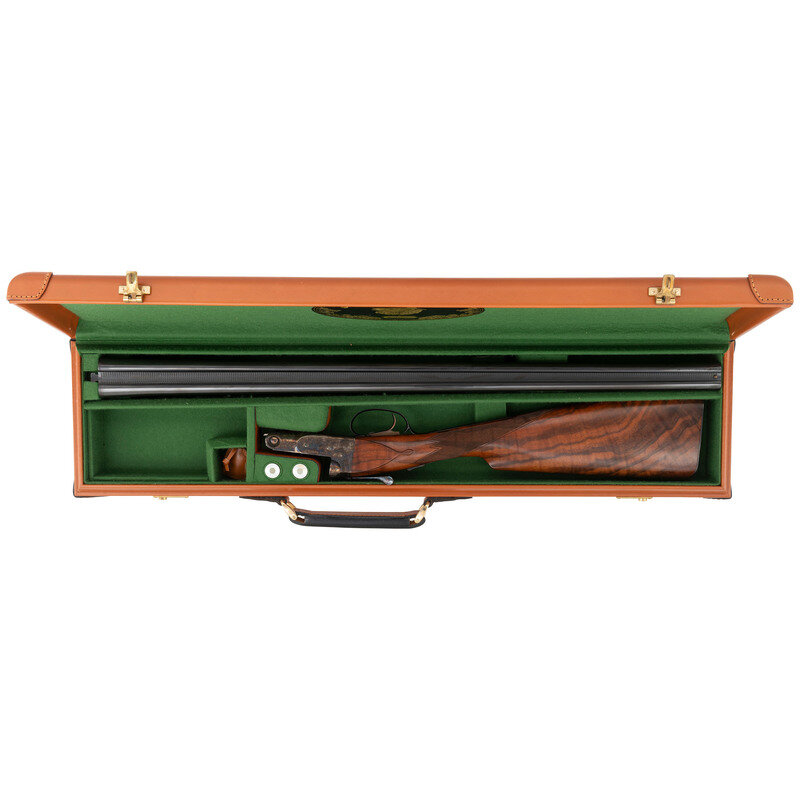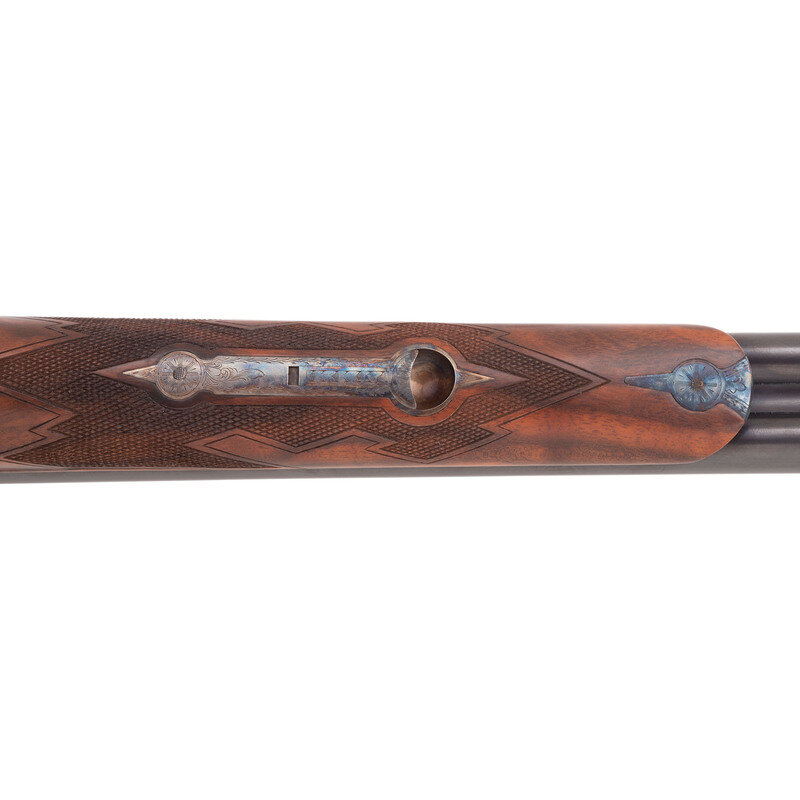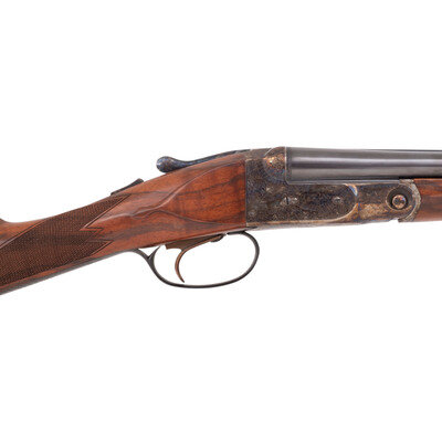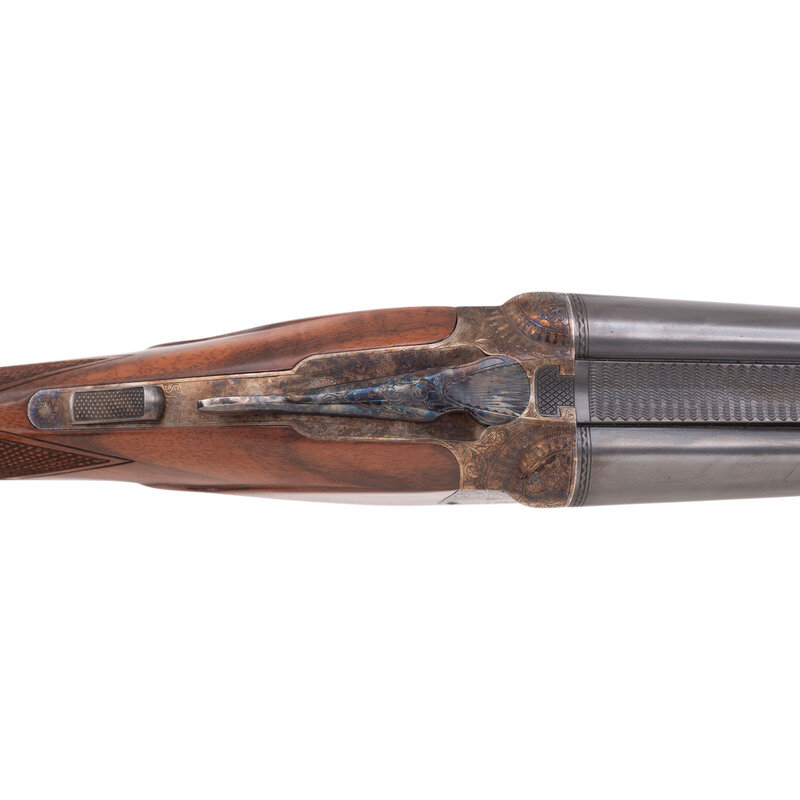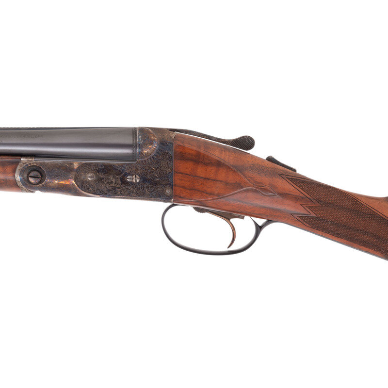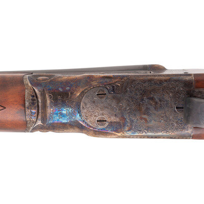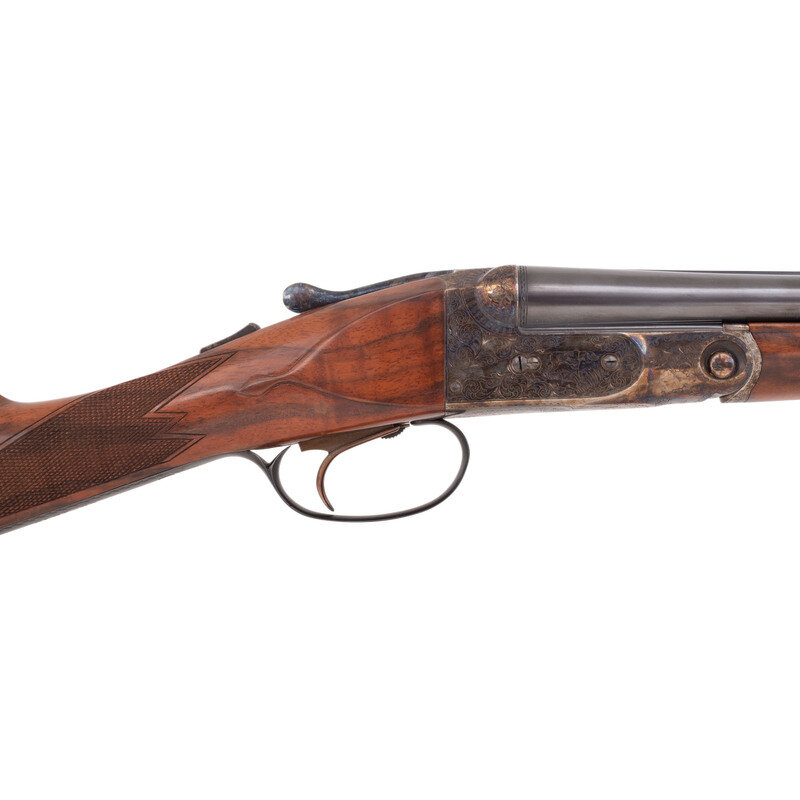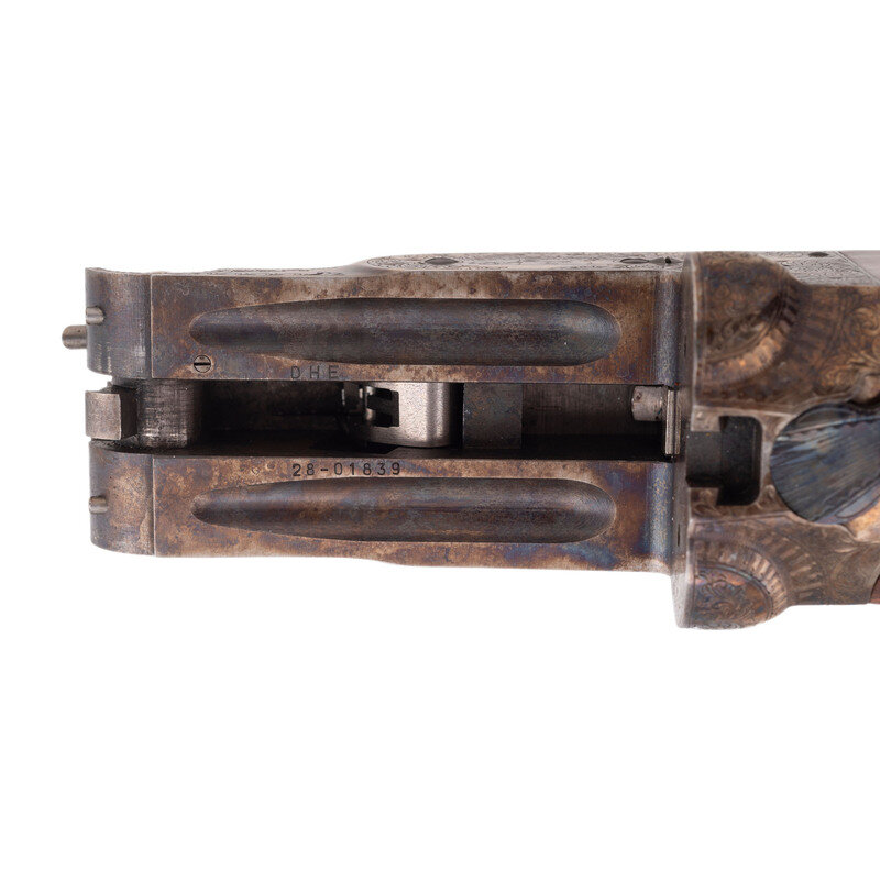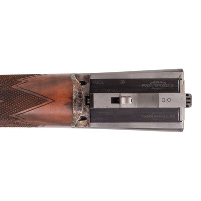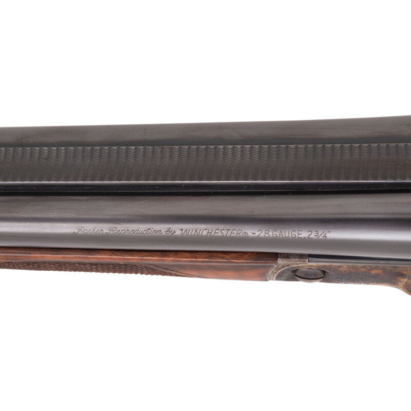 28 Gauge. 28" barrel length. SN: 28-1839. 2.75" chamber length. Full Choke left. Modified right. Blued barrels and triggerguard with the balance of parts casehardened and set in a walnut straight wrist stock with splinter forend, both featuring bordered multipoint checkering. Double barrel side by side boxlock ejector shotgun mounting a matted barrel rib with brass bead front sight, and engraved embellishments to the frame. Item mounts a selector trigger and a tang mounted safety mechanism. Manufacturer marks include PARKER engraved to lower frame with barrel flats marked OVERLOAD/PARKER REPRODUCTION/PROVED. Winchester monogram proof struck into the barrel flats with the left barrel additionally marked MADE IN JAPAN. Upper left barrel displays the maker marking Parker Reproduction by WINCHESTER. The barrel lug displays size mark 00, indicating its frame size. Shotgun features an engraved skeleton butt with the wood checkered, and a gold oval plate to the toe. Item is engraved with spiral scroll over the frame enclosing pointers on the flanks, and rising game birds to the lower frame. Further features sunburst borders to the barrel fences and around the lug. The dollshead and breeches are further border engraved, and the muzzle end of the barrel rib shows a crisp Parker style border. Comes in a matching leather bound case with green velvet lining and PARKER REPRODUCTIONS tag to the lid. Included in the case are two 28 gauge snap caps, and a pair of brass keys for the case. Item further features a canvas and leather sleeve. {MODERN}