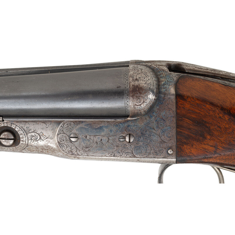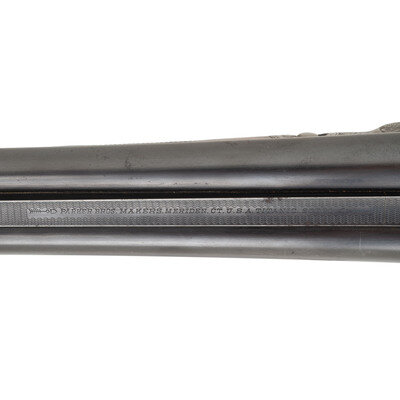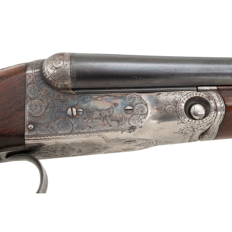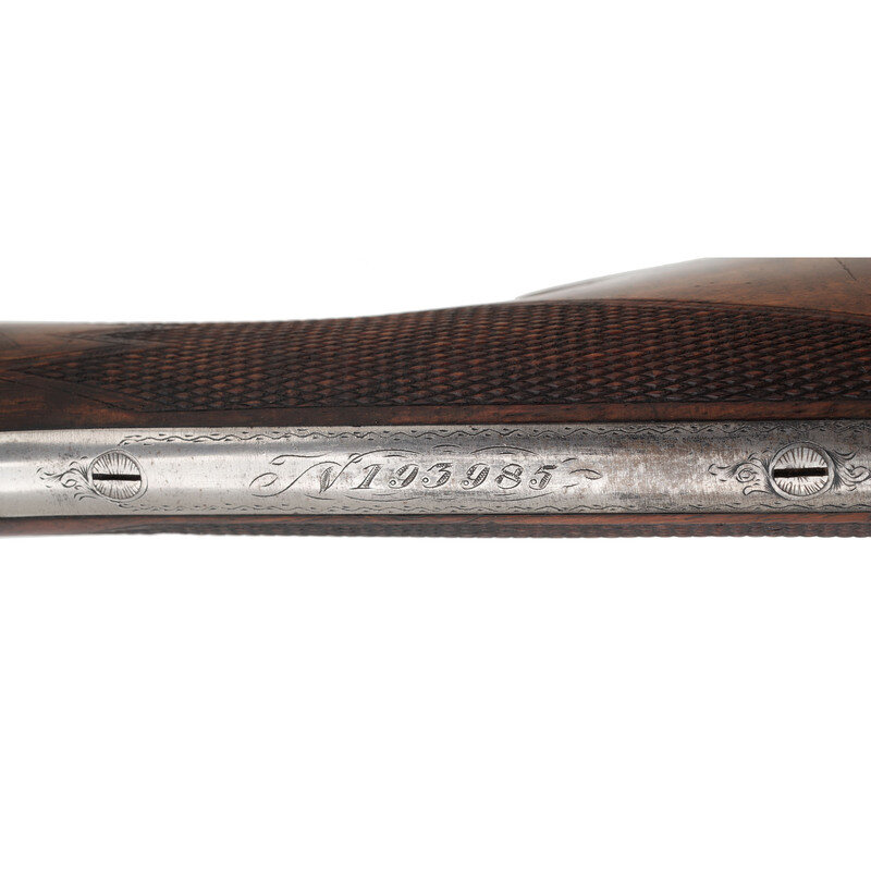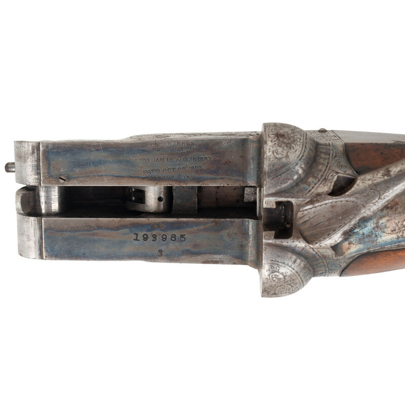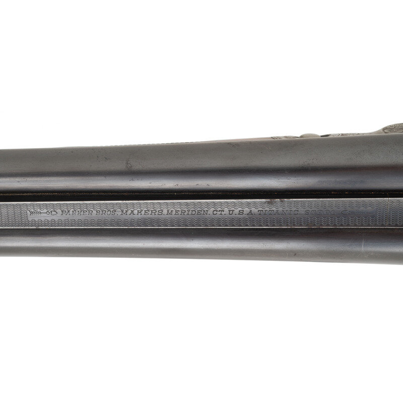 20 Gauge. 28" barrel length. SN: 193985. Blued barrels with casehardened frame mounting engraved skeleton buttplate on a walnut straight English style stock paired with splinter forend. Double barrel side by side boxlock extractor shotgun mounting a single front bead sight on a matted barrel rib that retains the border at the muzzle. Maker mark to barrel reads PARKER BROS. MAKERS. MERIDEN. CT. U.S.A. TITANIC STEEL. Frame is engraved with PARKER BROS banners enclosed by spiral scroll engraving with further game scene vignettes showing {pointers} to both flanks and {Pheasants} to lower frame. Item features highly figured walnut stock with bordered multipoint checkering to wrist and forend, and an oval plate to the toe engraved with the name Arendt. Shotgun shows the DH model stamp to the watertables along with triple patent dates of 1887, 1910, and 1905. Barrel lug shows the 20 gauge marking and a 0 frame size mark. Comes with a leather "Leg of Mutton" pattern travel case. 14" length of pull. 1.625" drop to comb. 2.75" drop to heel. {C&R}
